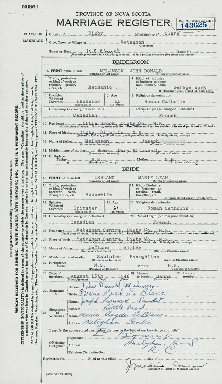 24. Place of birth Meteghan Centre, Digby County