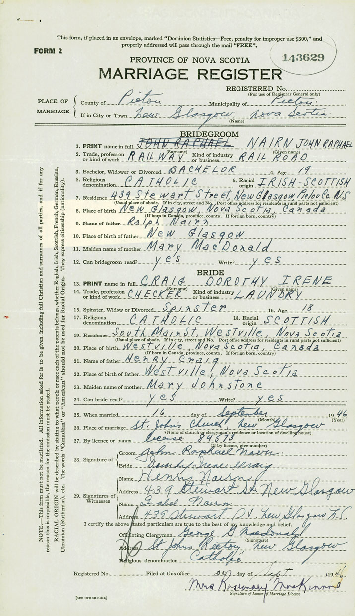 26. Place of marriage St. Johns Church New Glasgow, Pictou County