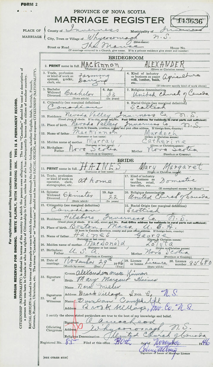 28. Date of marriage November 29 1946 29. By license or banns License 30. License number 85680
