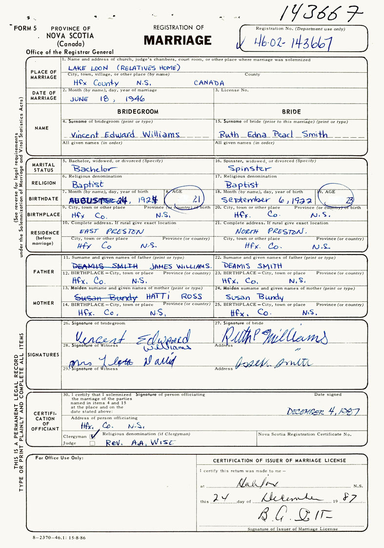 26. Place of marriage Relative's Home Lake Loon, Digby County