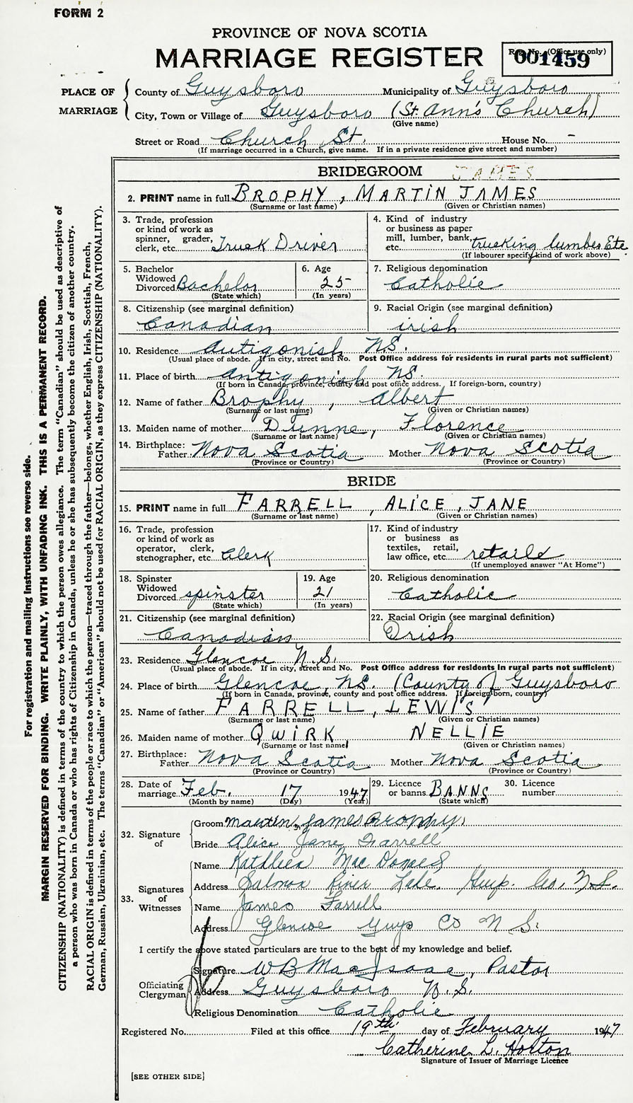 PLACE OF MARRIAGE County of Guysborough