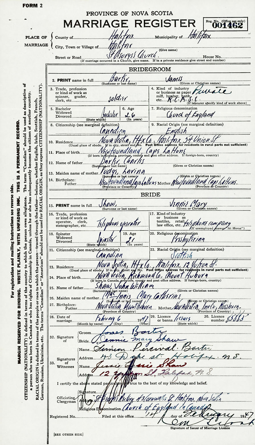 28. Date of marriage February 6 1947 29. By license or banns License 30. License number 85885