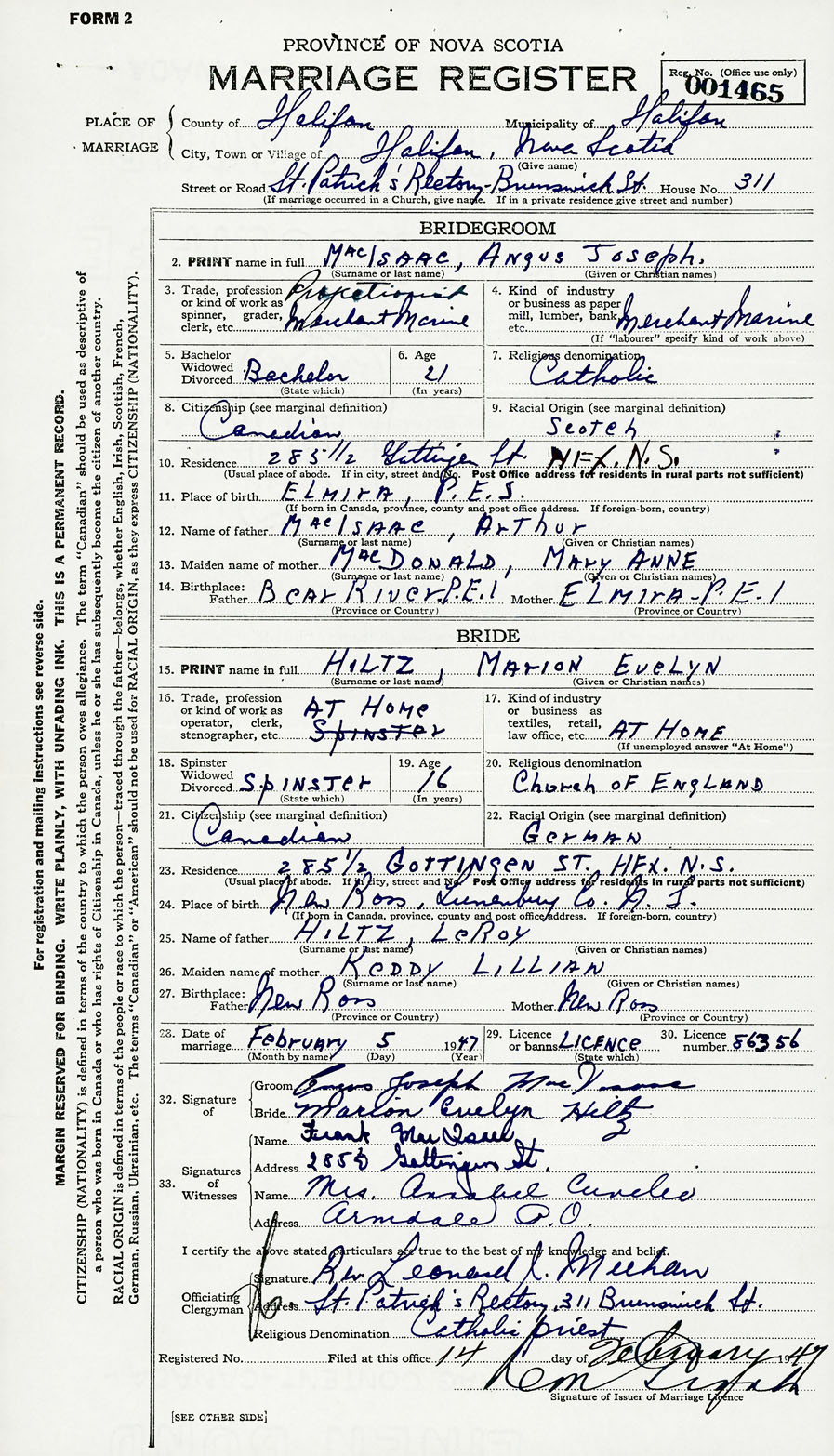 28. Date of marriage February 5 1947 29. By license or banns License 30. License number 86356
