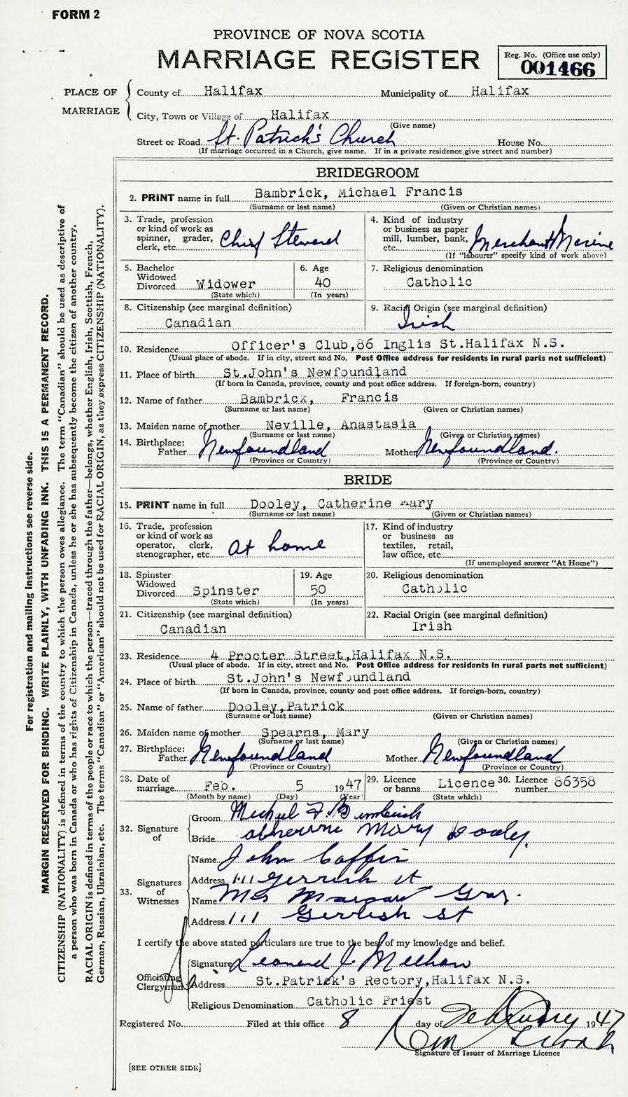 28. Date of marriage February 5 1947 29. By license or banns License 30. License number 86358