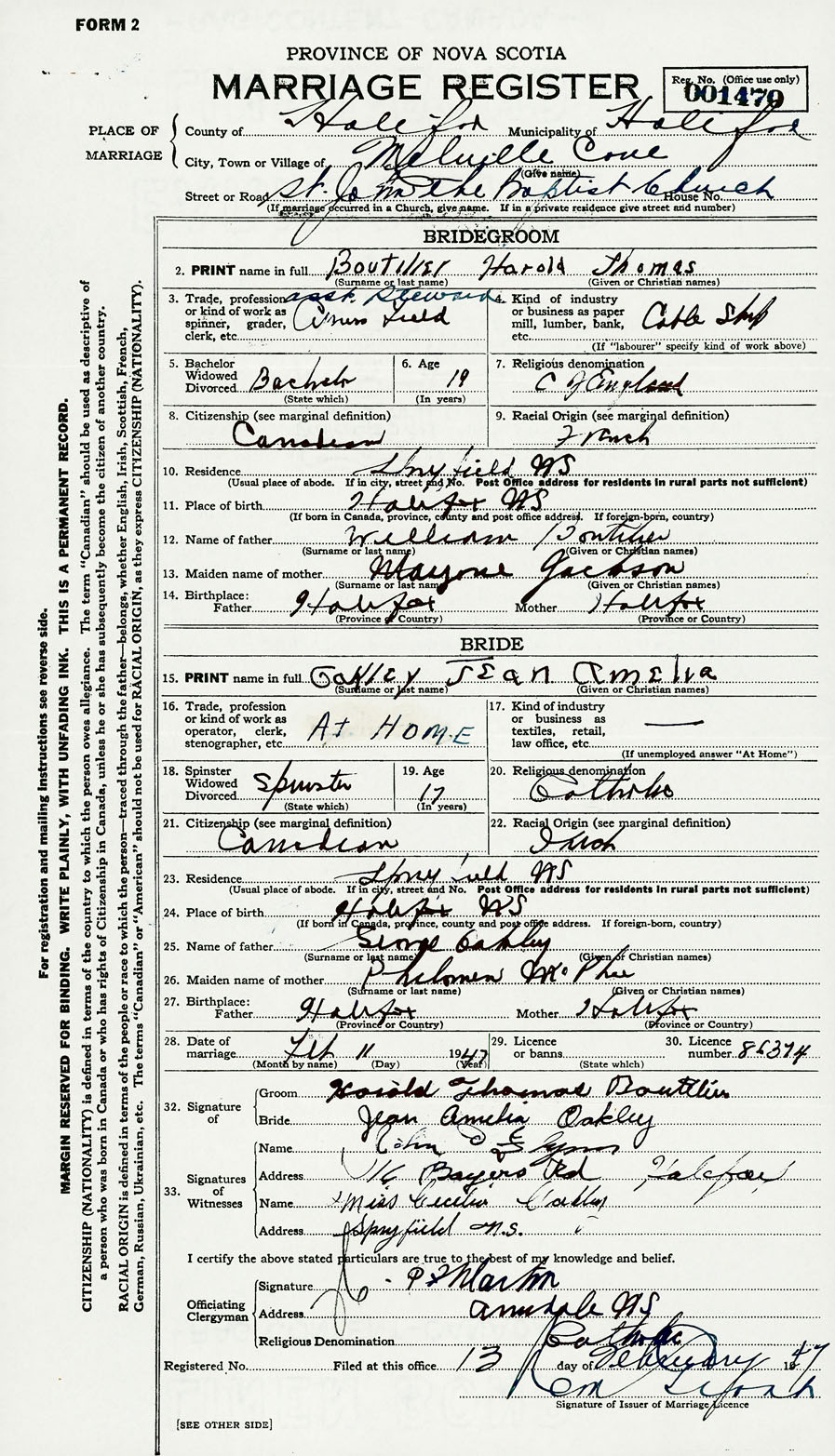 Groom Harold Thomas Boutilier