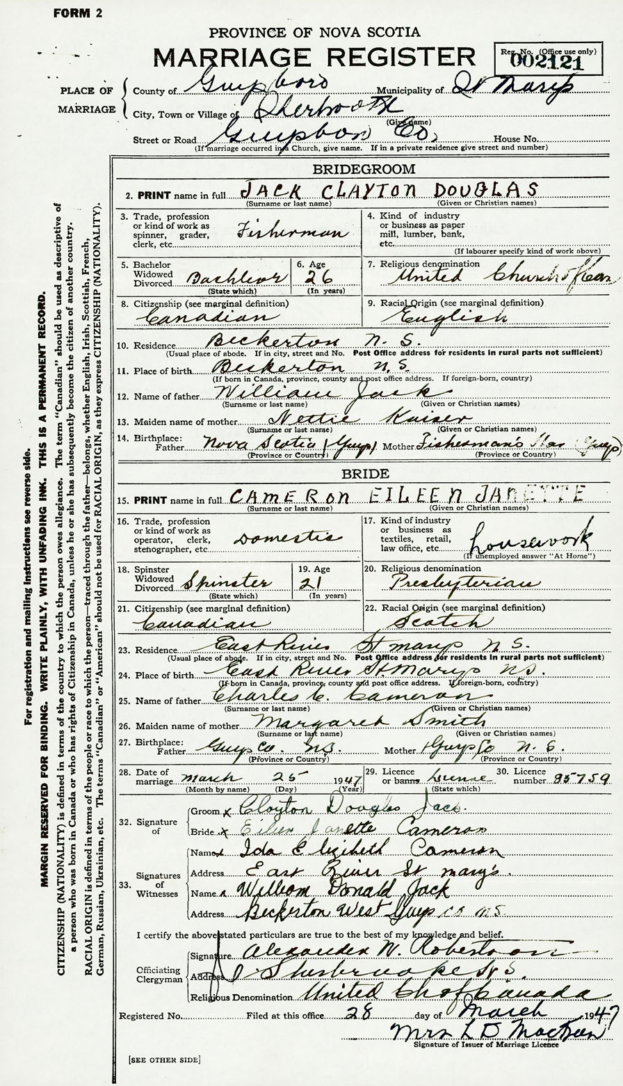 28. Date of marriage March 25 1947 29. By license or banns License 30. License number 85759