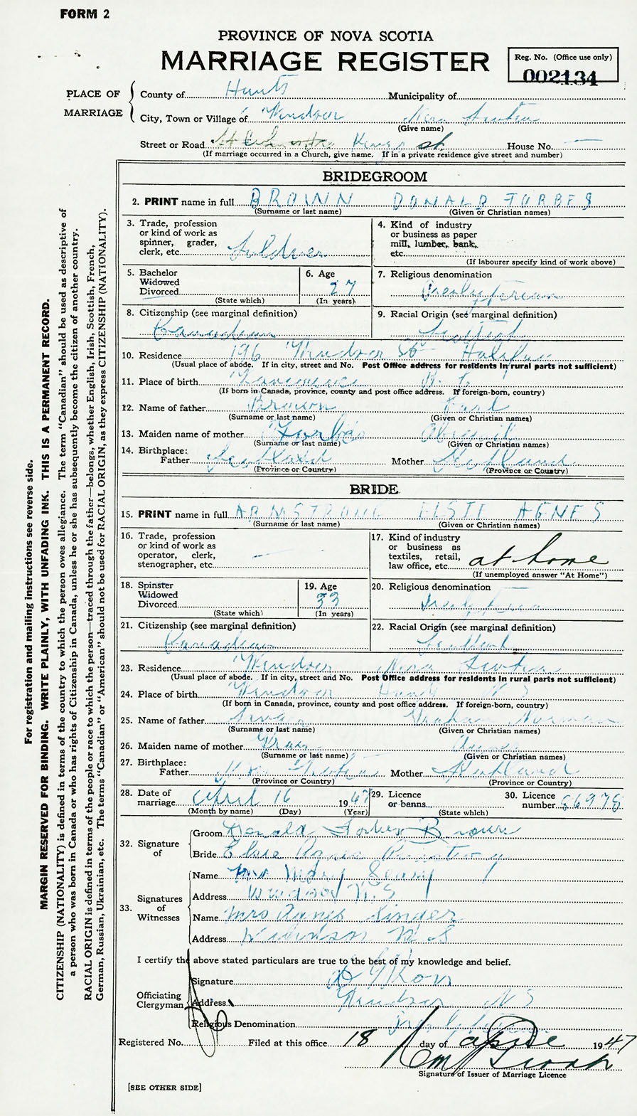 28. Date of marriage April 16 1947 29. By license or banns License 30. License number 86978