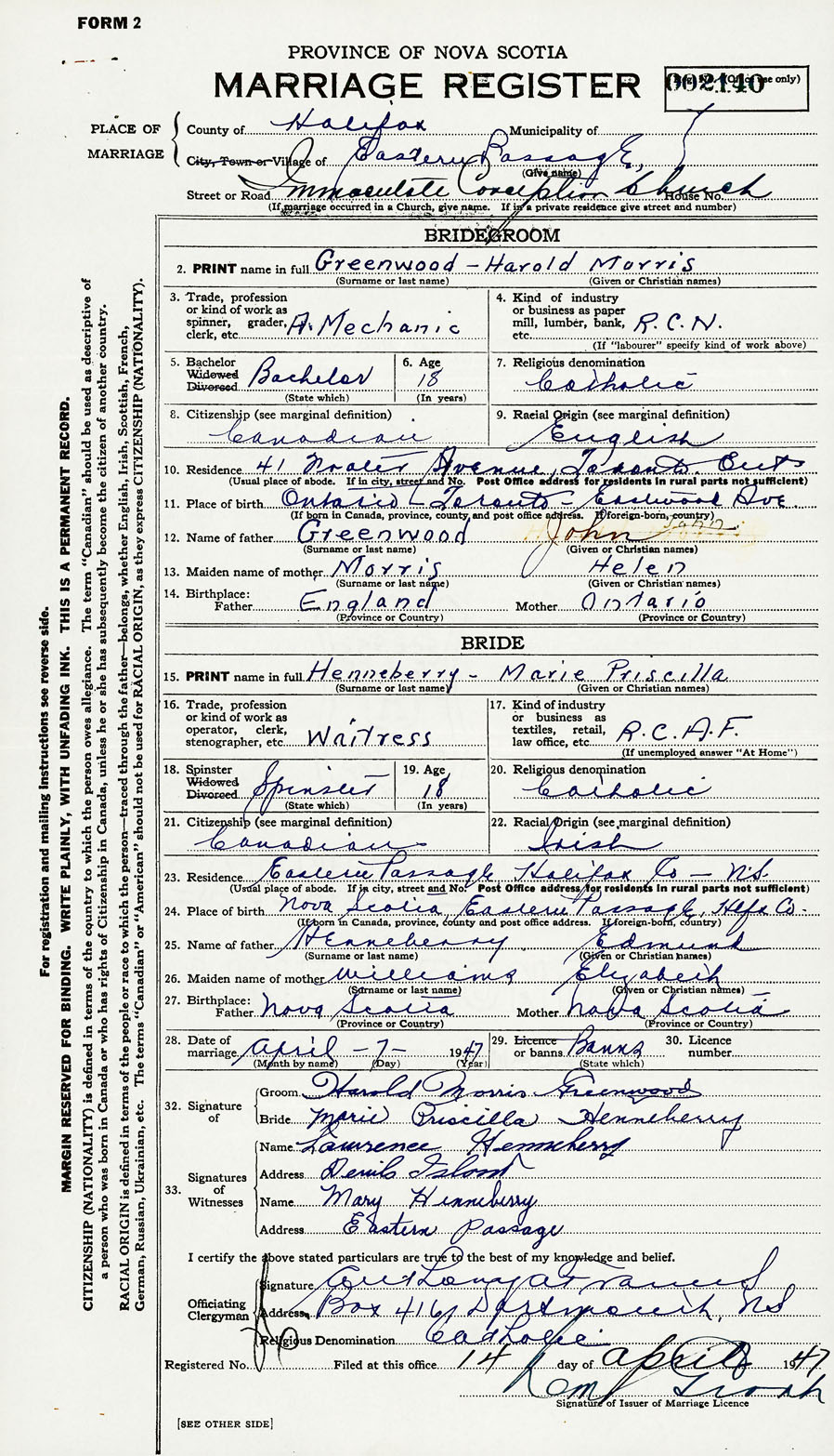 28. Date of marriage April 7 1947 29. By license or banns License 30. License number