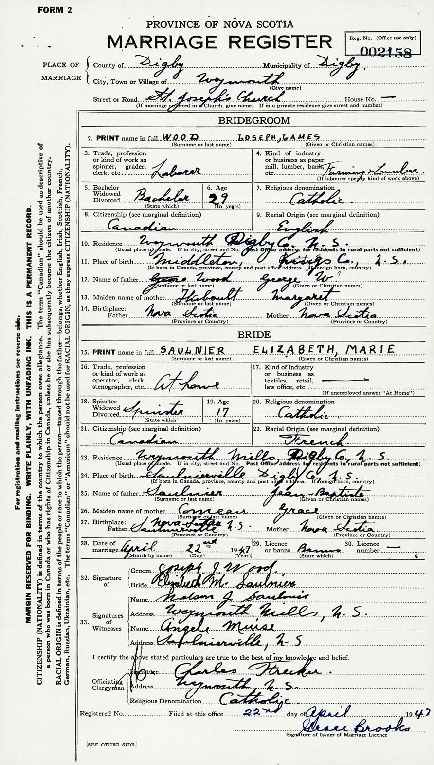 27. Birthplace Father Saulnierville, Digby County, Nova Scotia Mother Nova Scotia