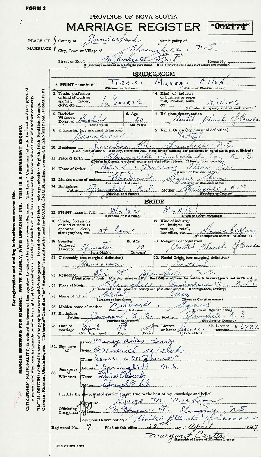 27. Birthplace Father Canaan, Nova Scotia Mother Springhill, Nova Scotia