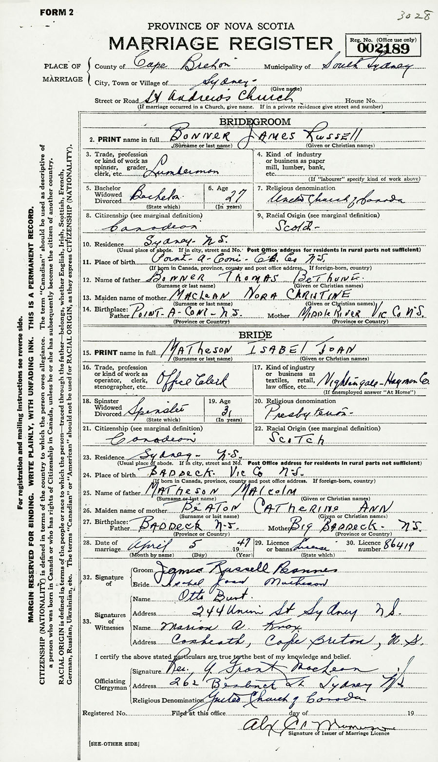 28. Date of marriage April 5 1947 29. By license or banns License 30. License number 86419