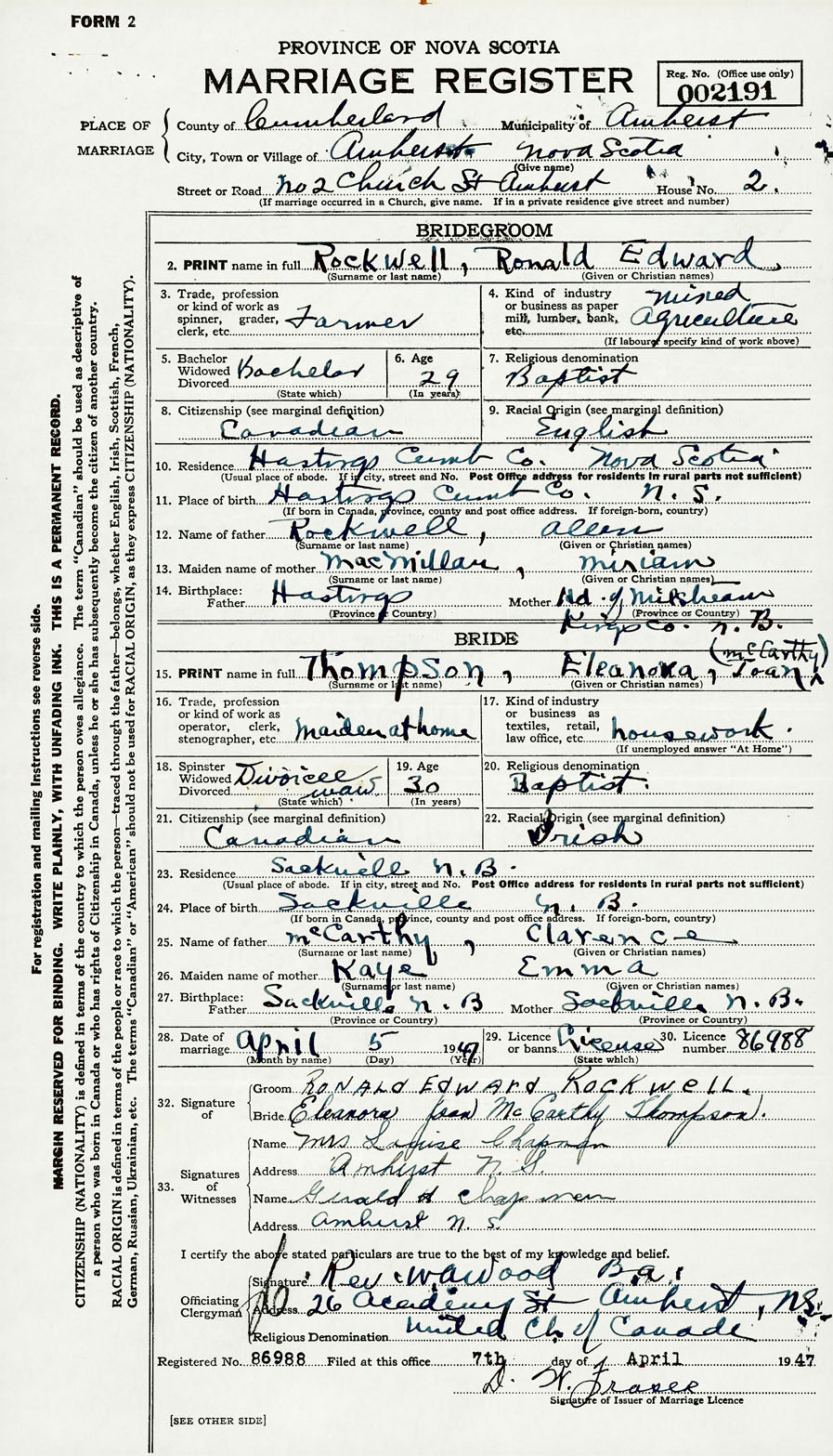 28. Date of marriage April 5 1947 29. By license or banns License 30. License number 86988