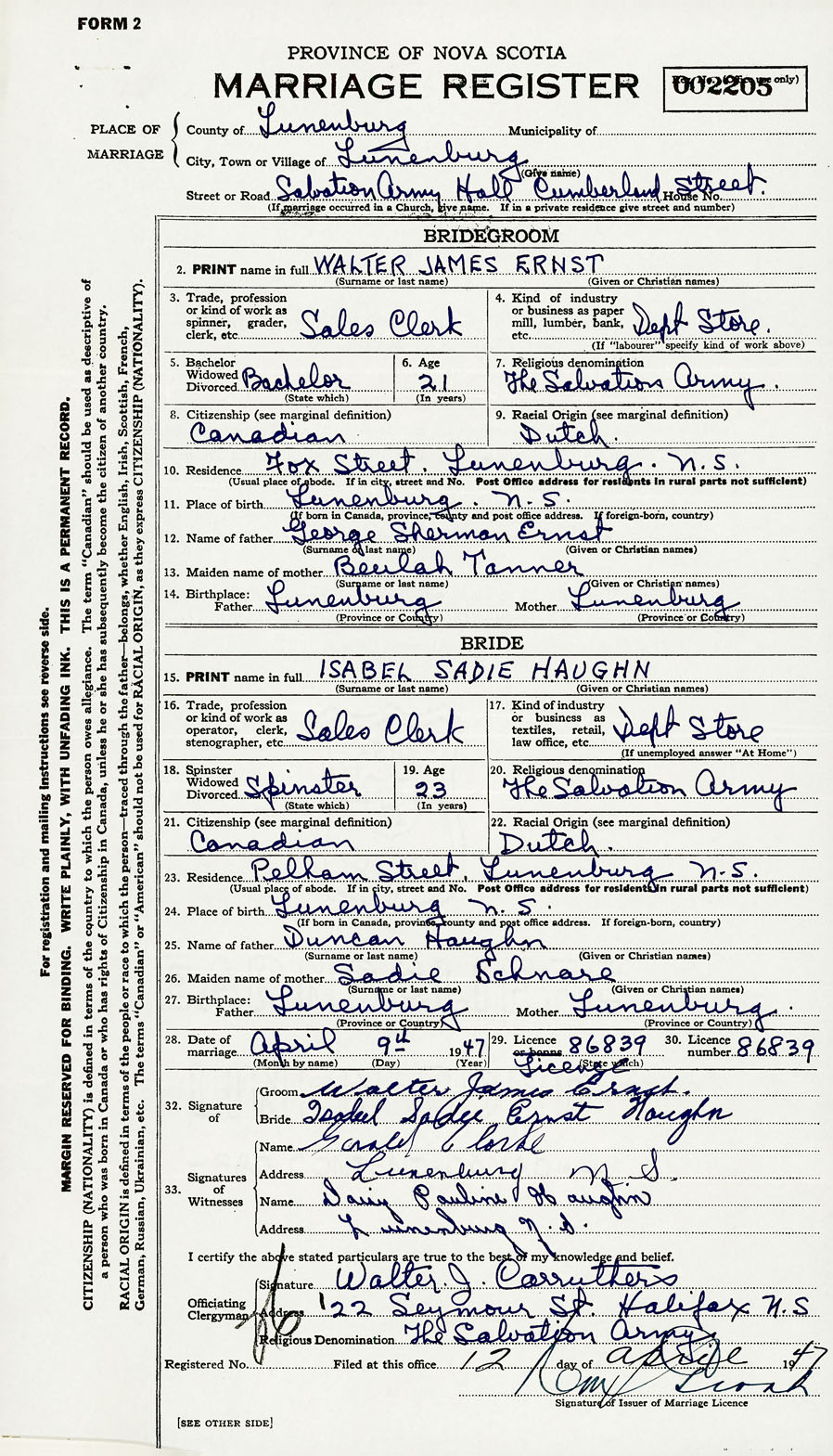 28. Date of marriage April 9 1947 29. By license or banns License 30. License number 86839
