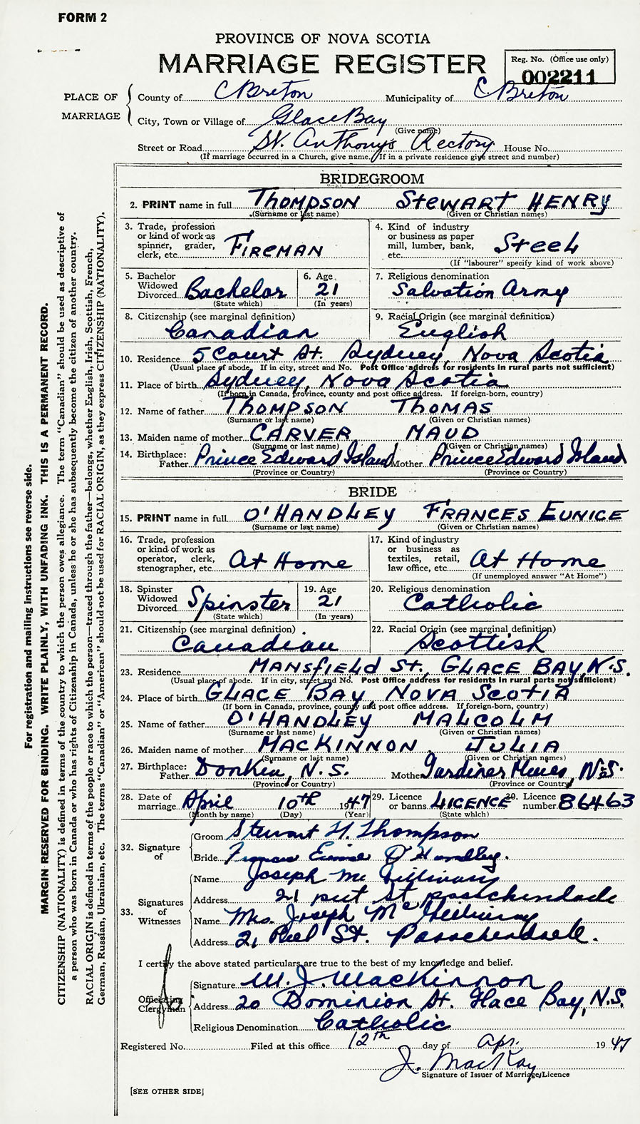 11. Place of birth Sydney, Cape Breton County, Nova Scotia