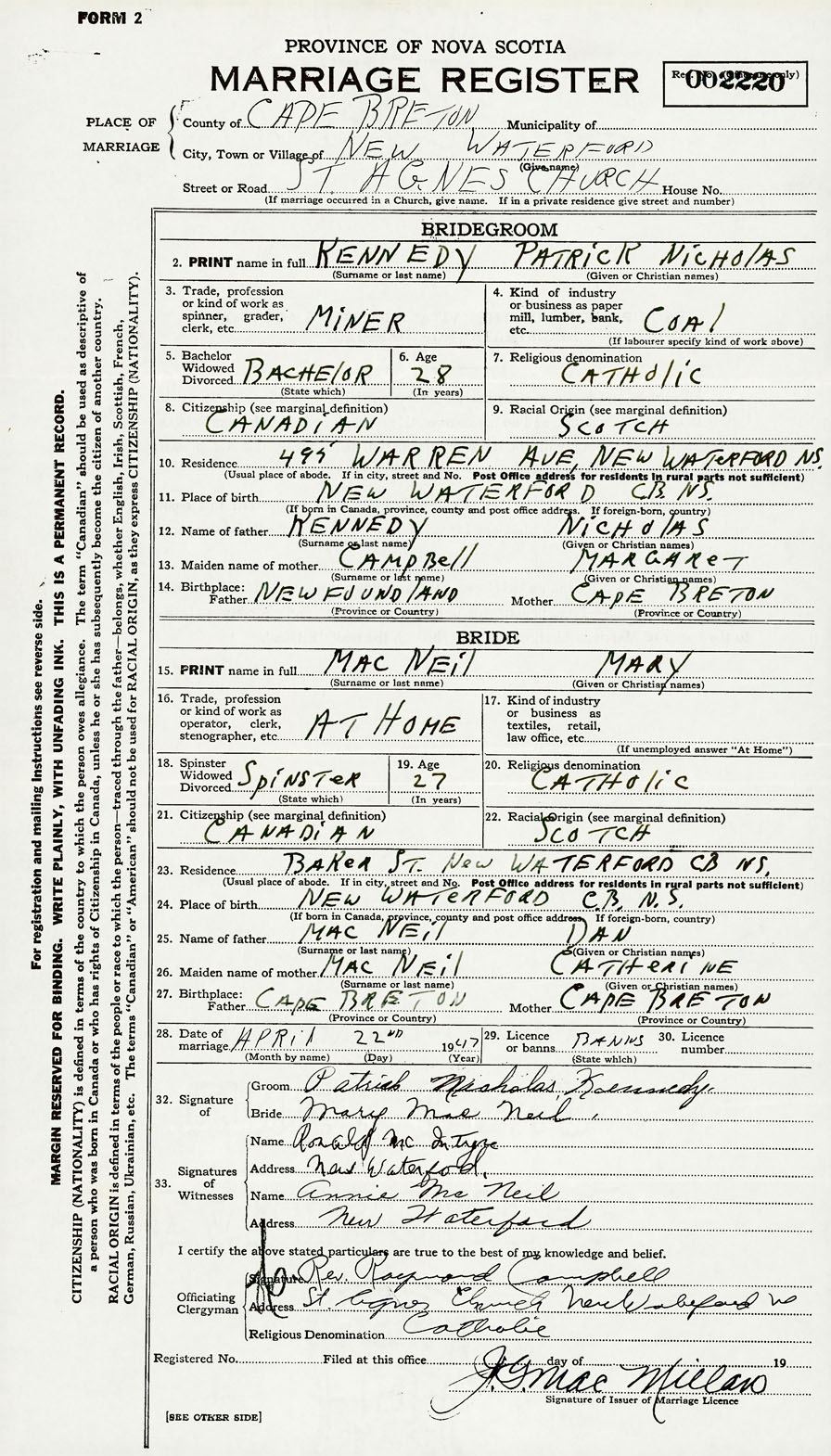 11. Place of birth New Waterford, Cape Breton County, Nova Scotia