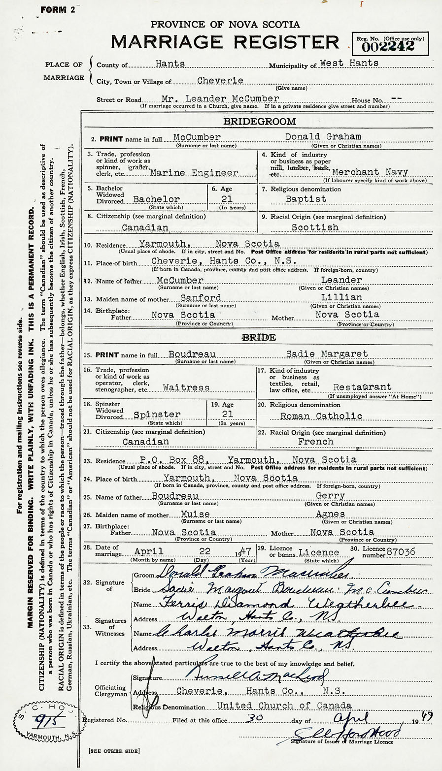 28. Date of marriage April 22 1947 29. By license or banns License 30. License number 87036