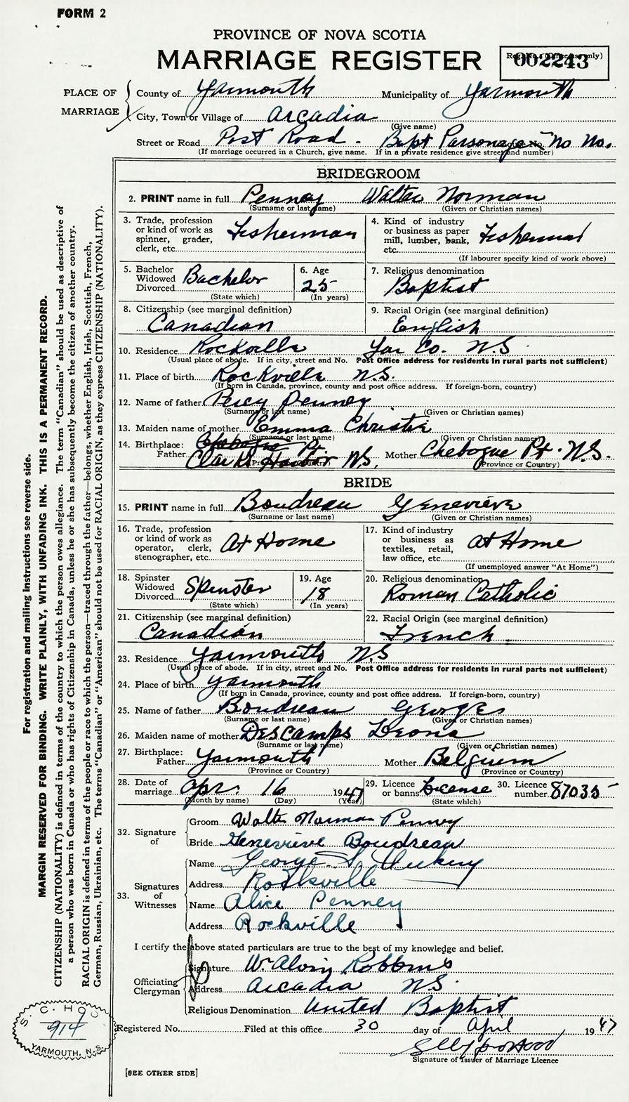 28. Date of marriage April 16 1947 29. By license or banns License 30. License number 87035