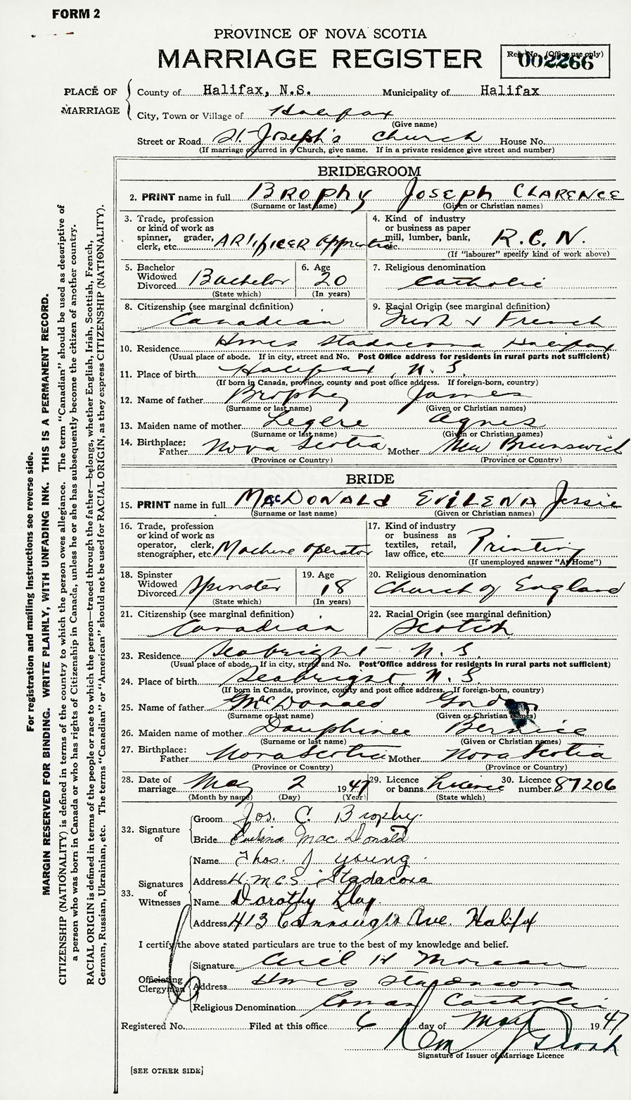 28. Date of marriage May 2 1947 29. By license or banns License 30. License number 87206