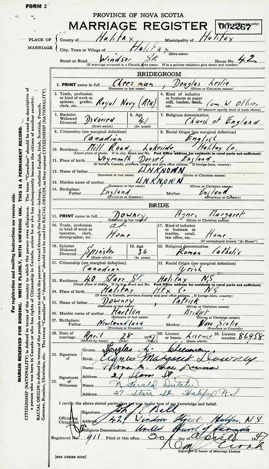 28. Date of marriage April 28 1947 29. By license or banns License 30. License number 86958