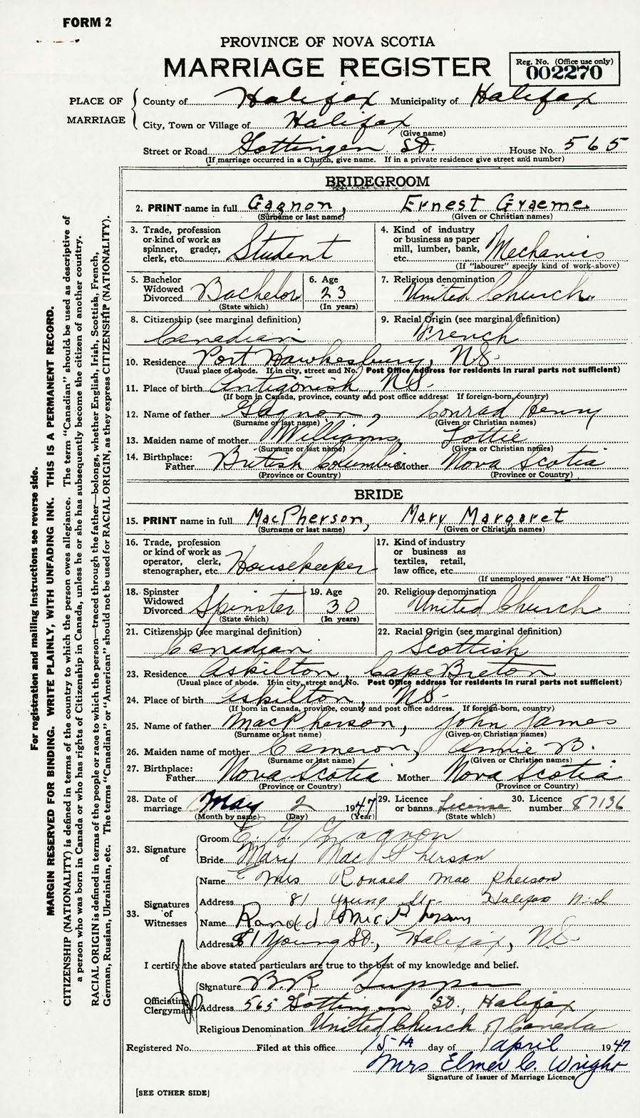 Groom Ernest Graeme Gagnon