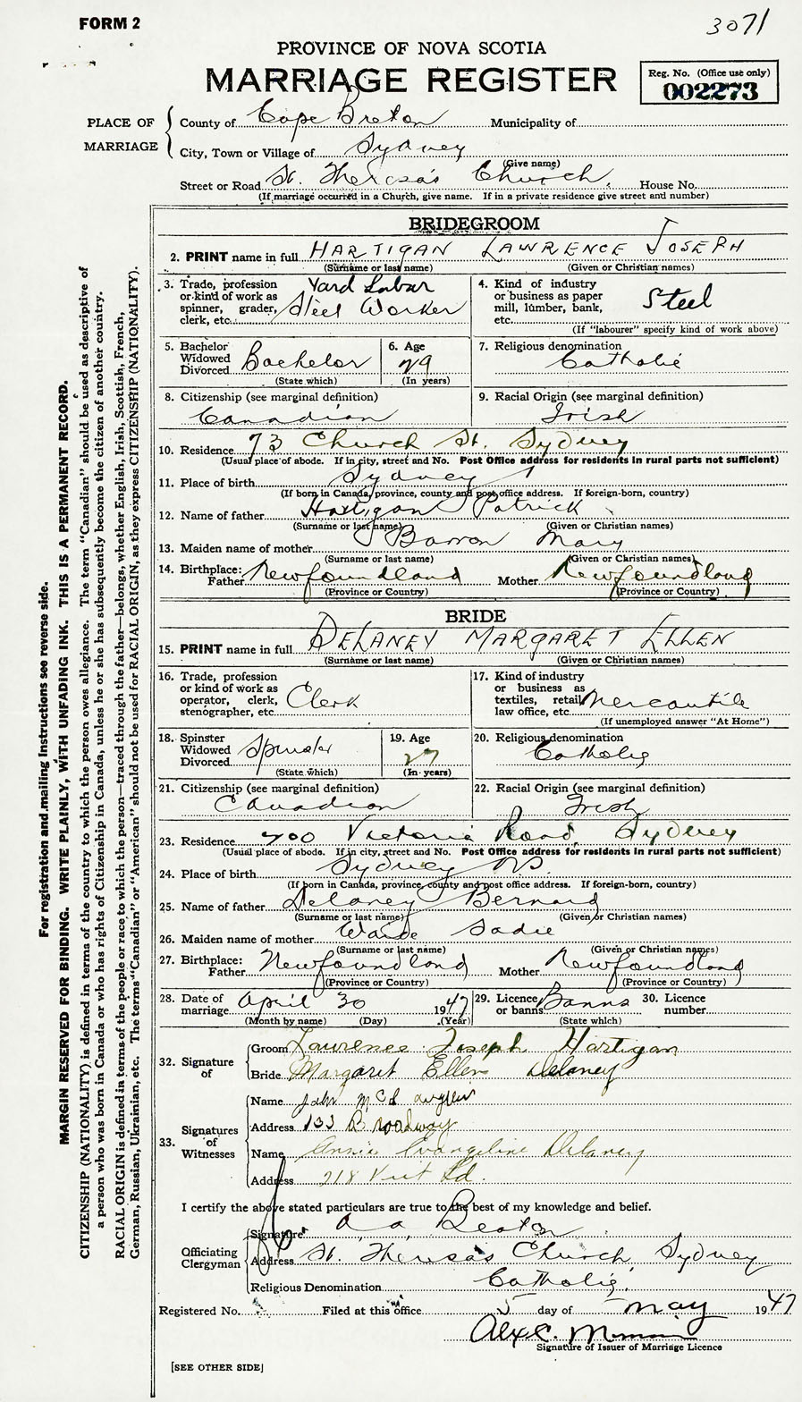 28. Date of marriage April 30 1947 29. By license or banns License 30. License number