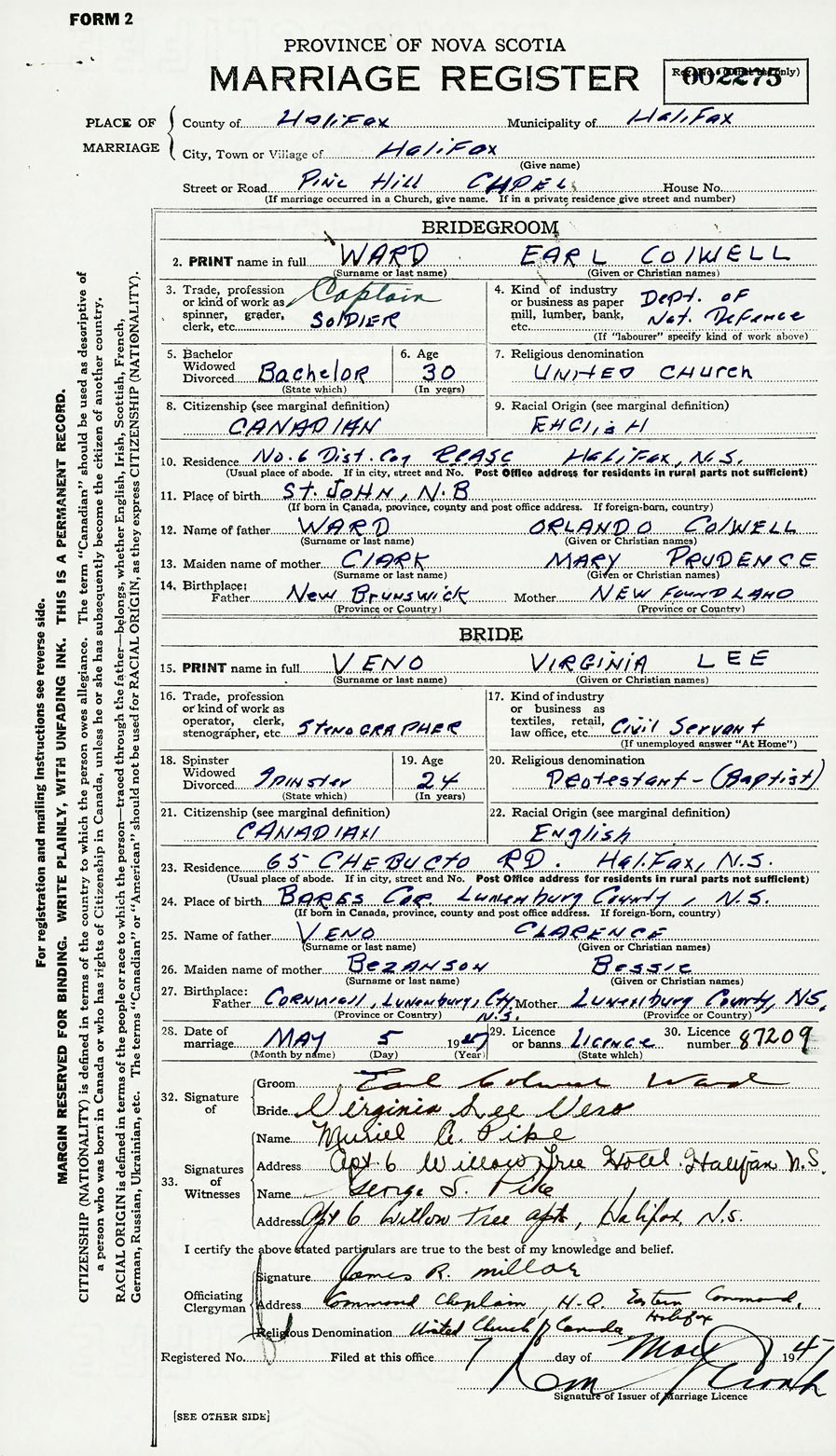 28. Date of marriage May 5 1947 29. By license or banns License 30. License number 87209