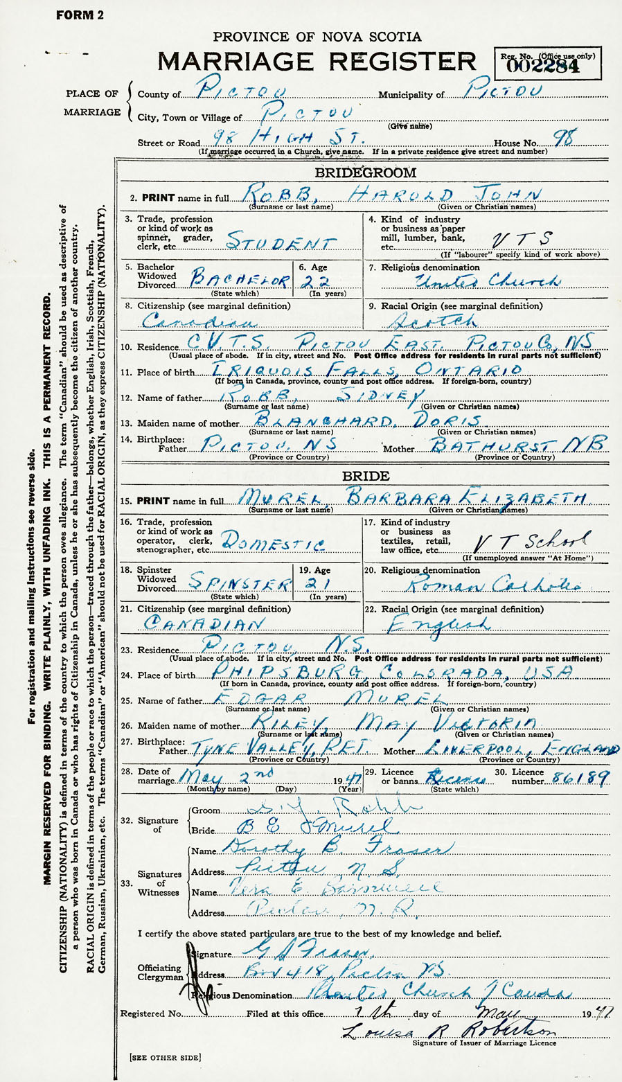 28. Date of marriage May 2 1947 29. By license or banns License 30. License number 86189