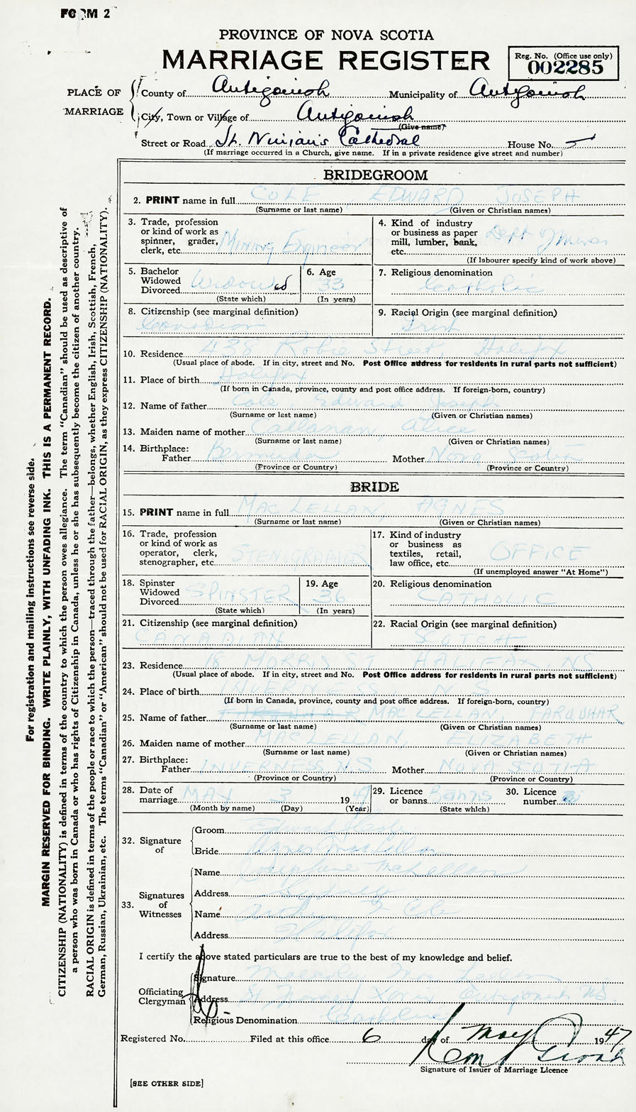 Registration: Year: 1947 number: 002285