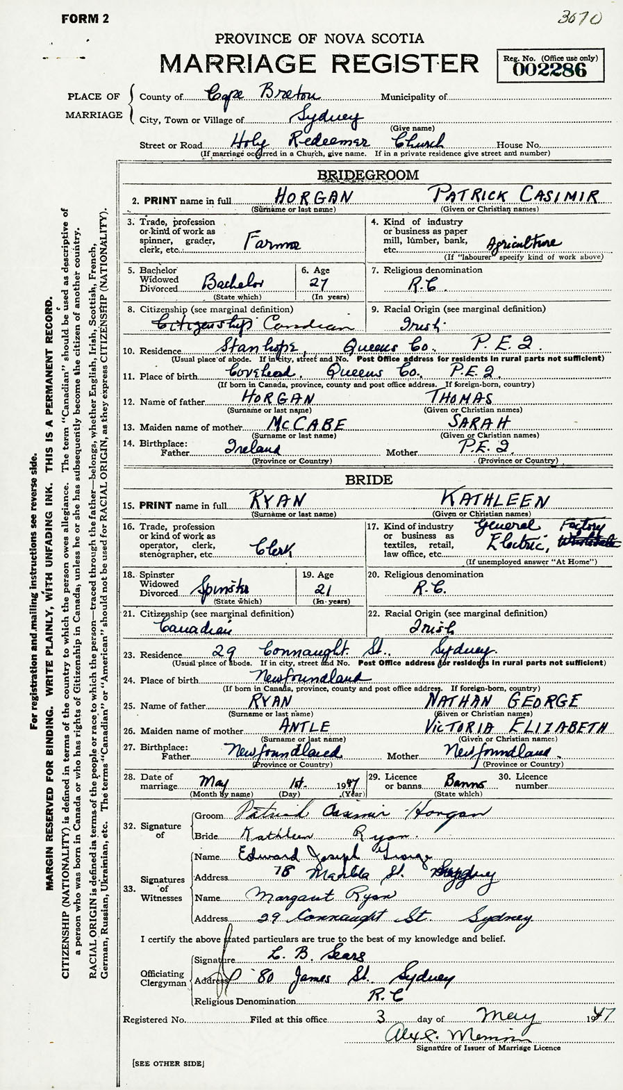 2. PRINT name in full Horgan, Patrick Casimir