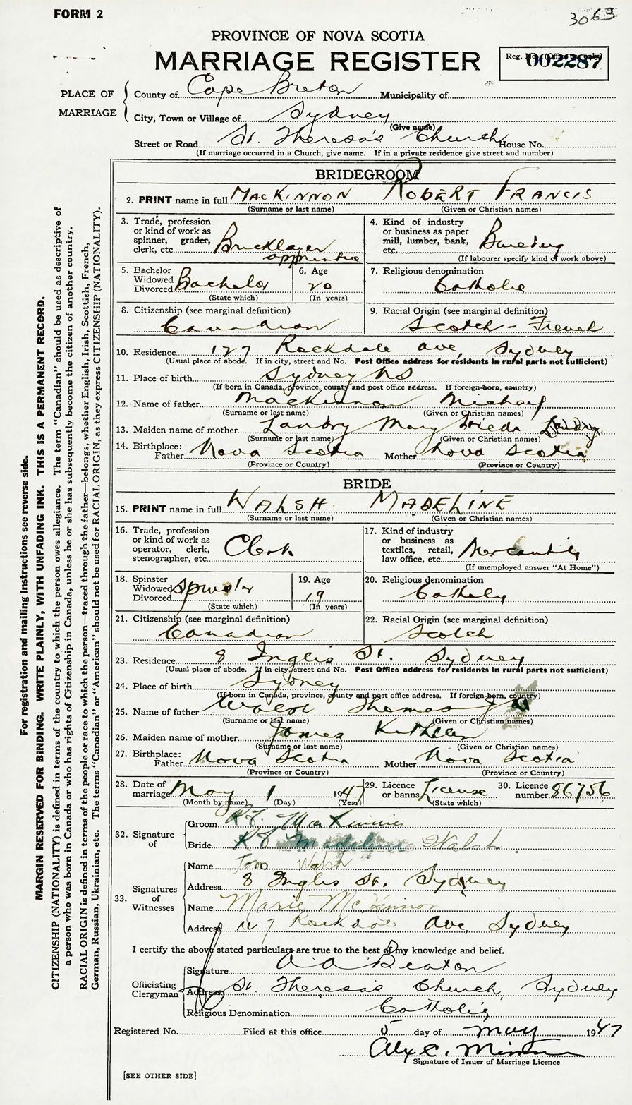 11. Place of birth Sydney, Cape Breton County, Nova Scotia