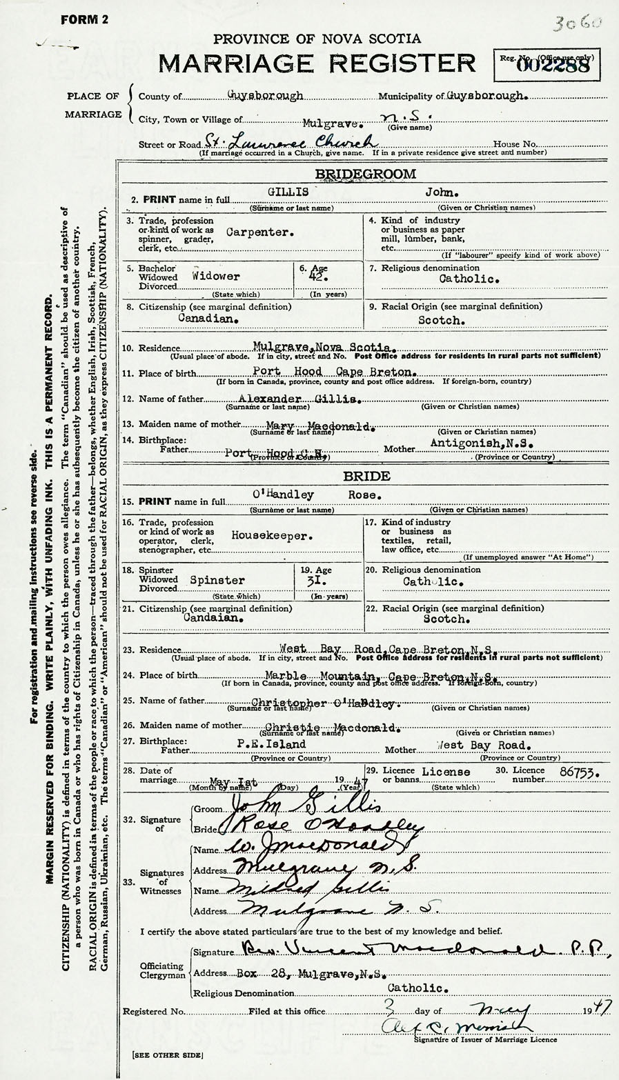 14. Birthplace Father Port Hood, Inverness County, Nova Scotia Mother Antigonish, Nova Scotia