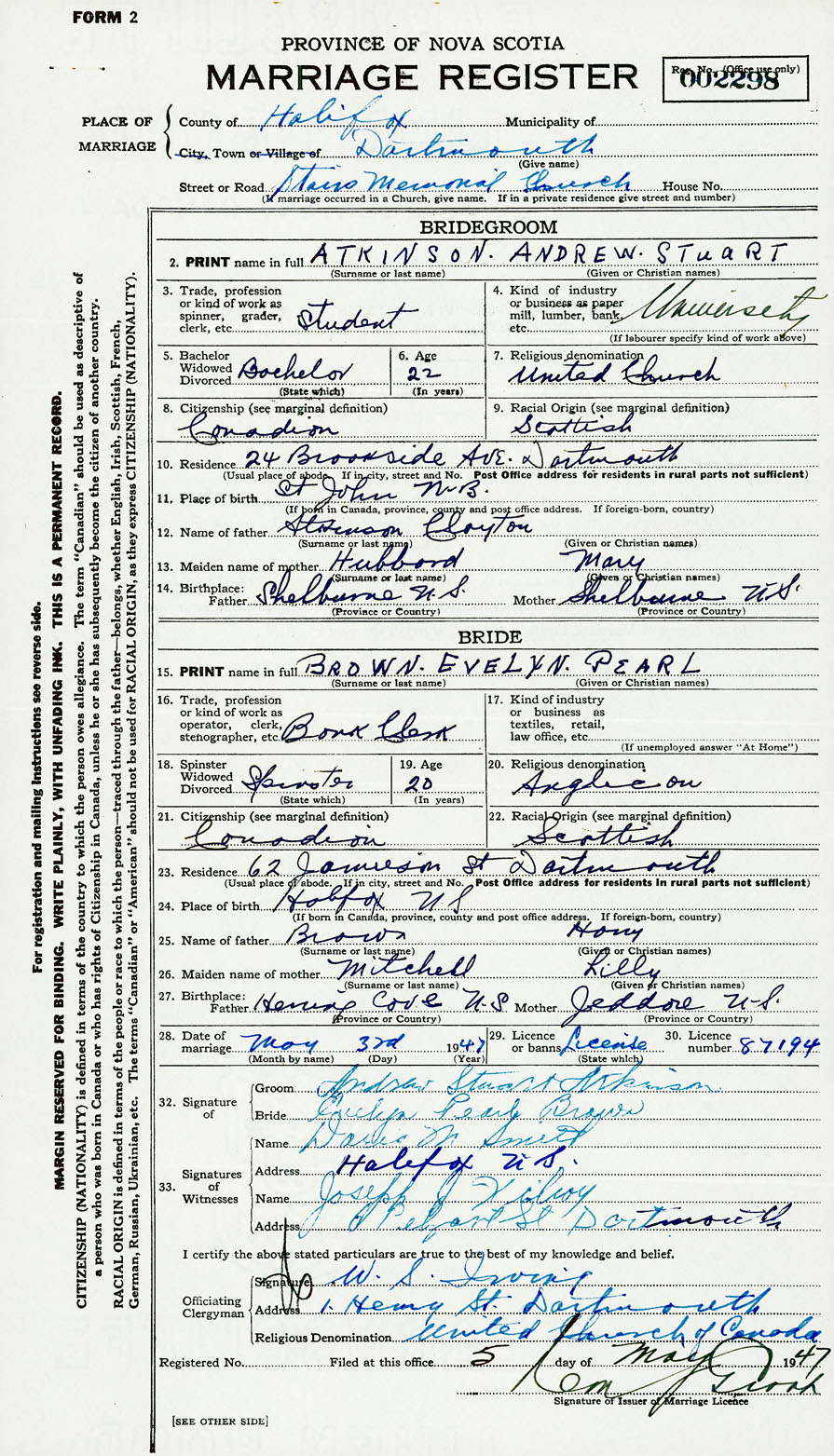 28. Date of marriage May 3 1947 29. By license or banns License 30. License number 87194