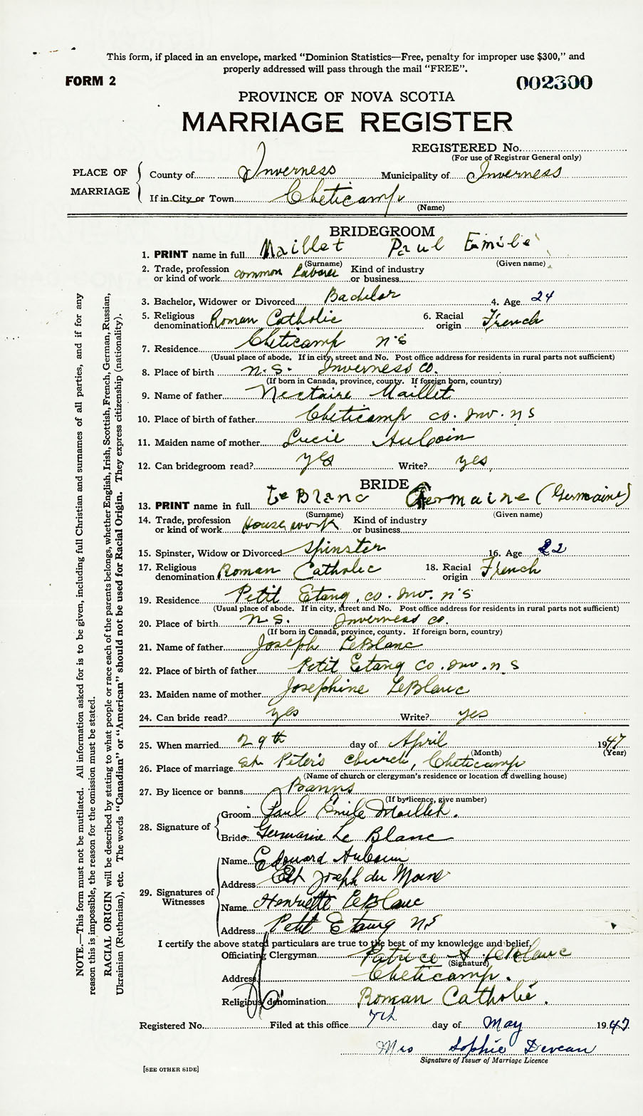 PLACE OF MARRIAGE County of Inverness in City or Town Cheticamp