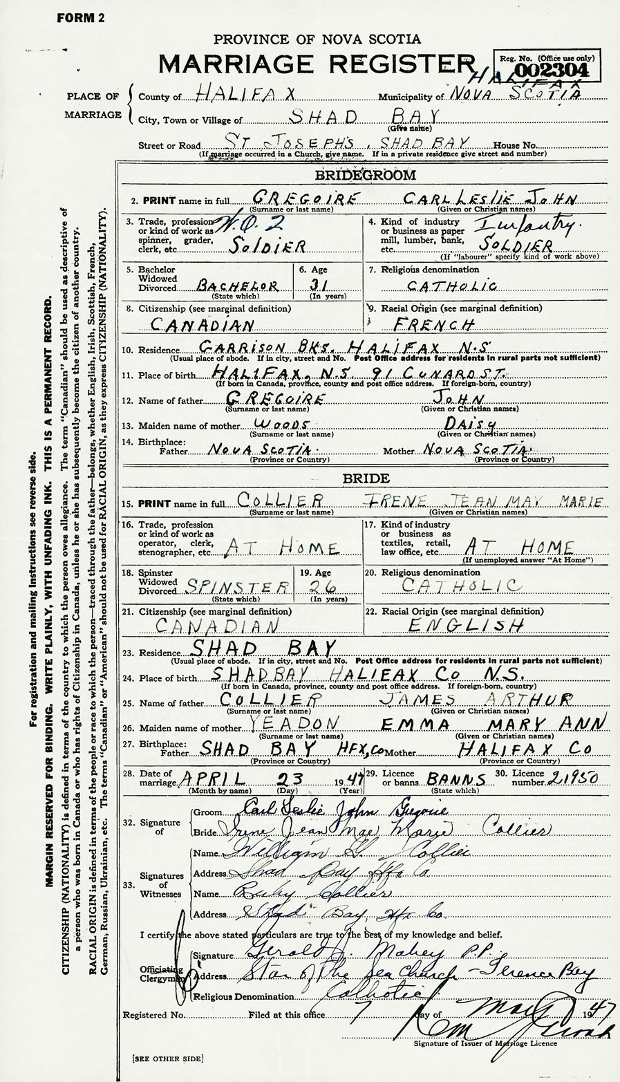 2. PRINT name in full Gregoire, Carl Leslie John