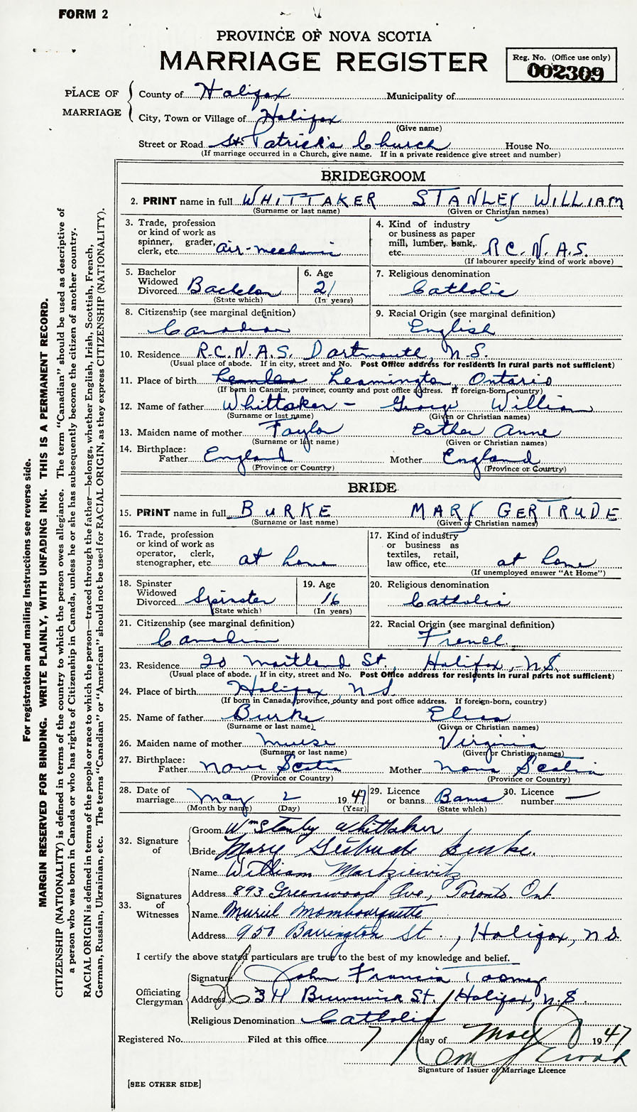 28. Date of marriage May 2 1947 29. By license or banns Banns 30. License number Banns