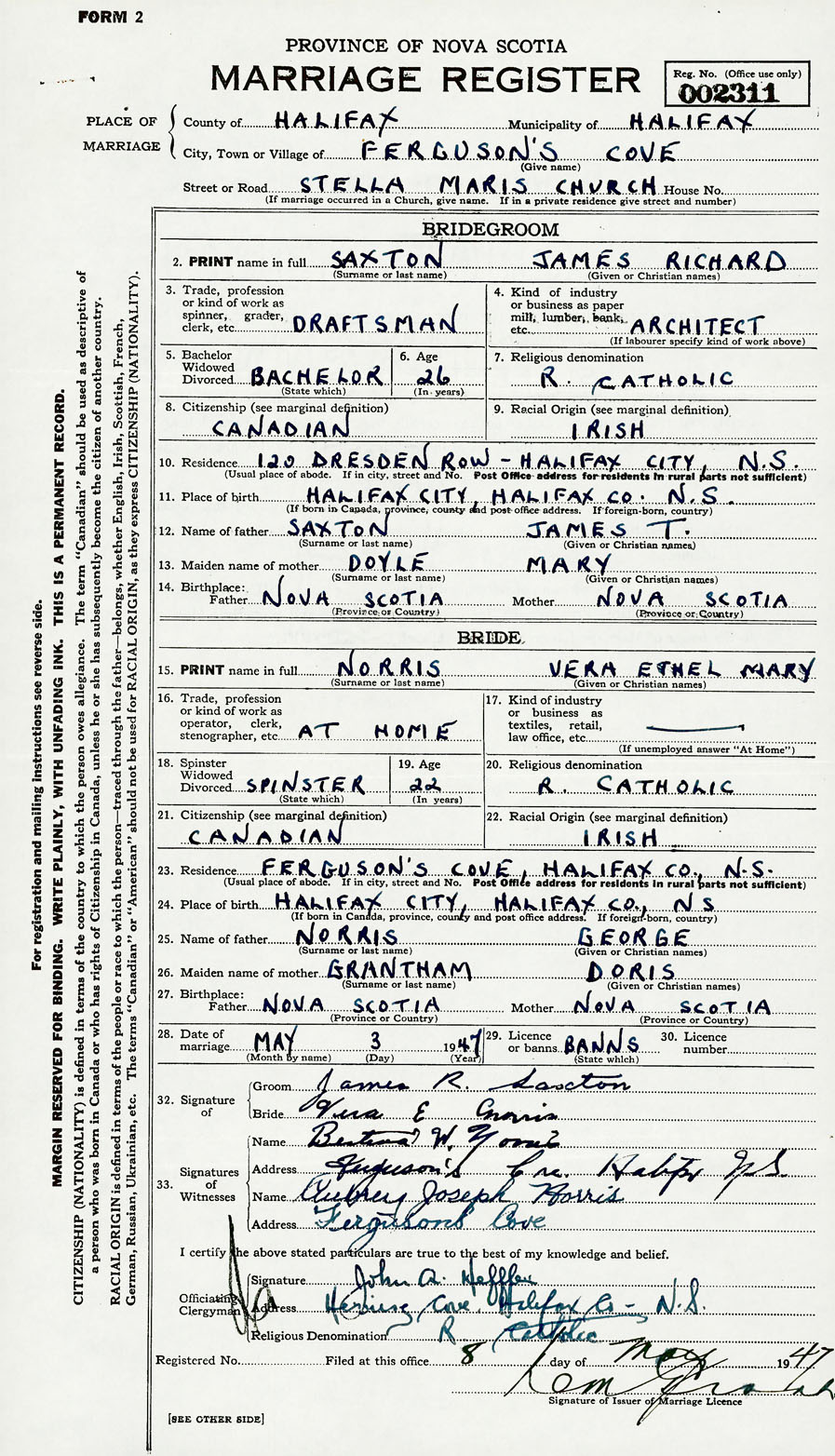 28. Date of marriage May 3 1947 29. By license or banns License 30. License number