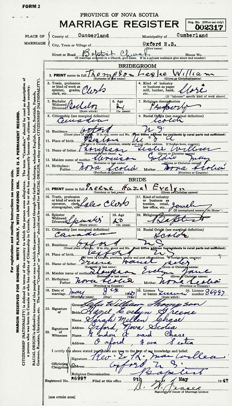 28. Date of marriage May 8 1947 29. By license or banns License 30. License number 86997