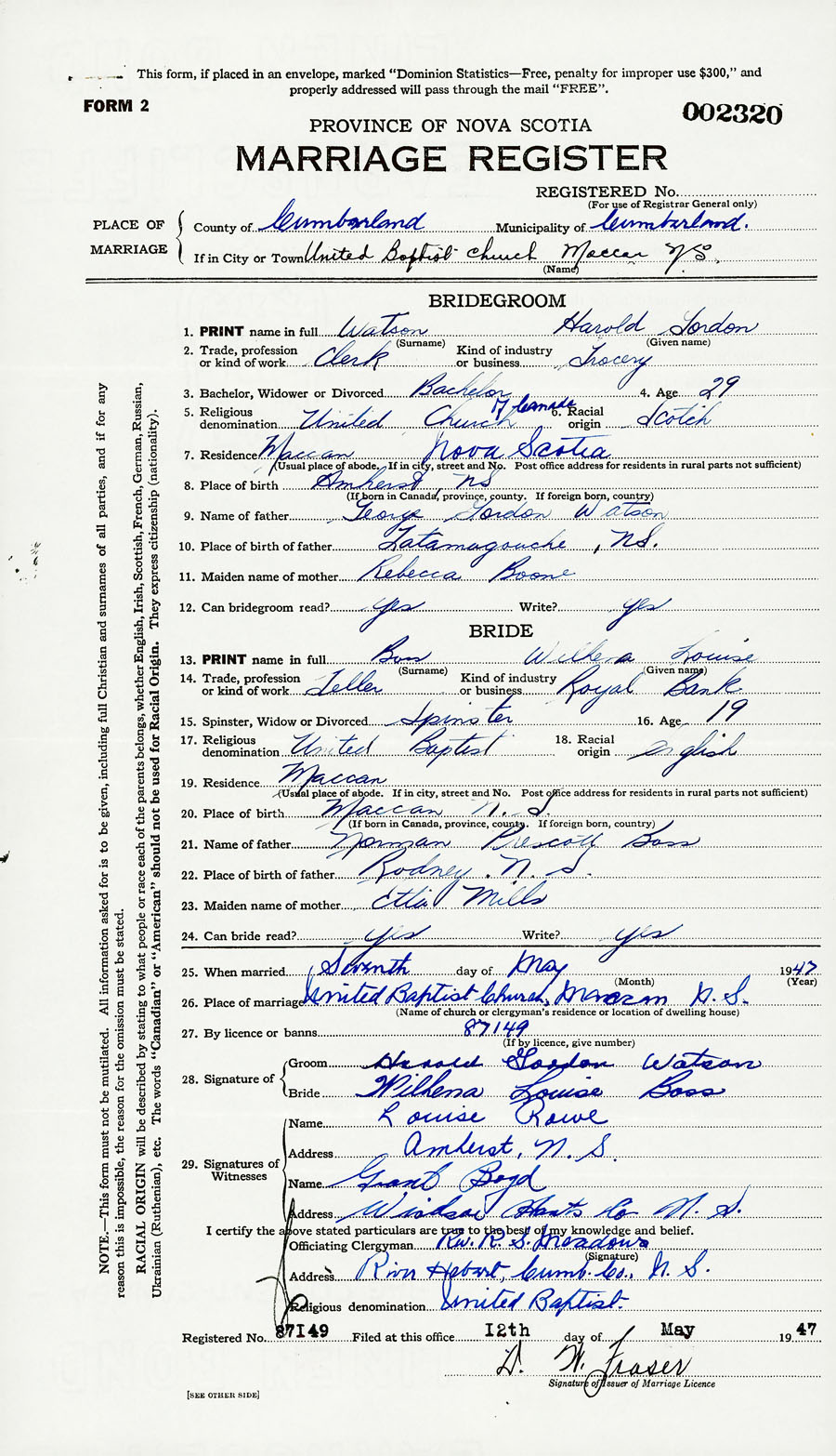 26. Place of marriage United Baptist Church Maccan, Cumberland County