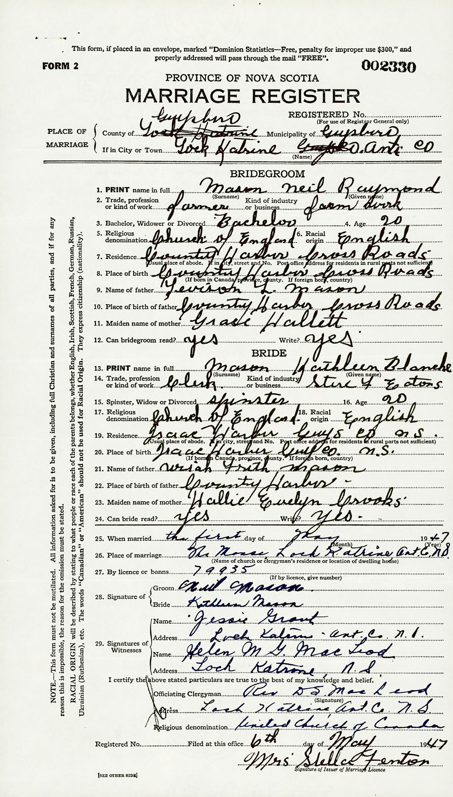 26. Place of marriage The Manse Loch Katrine, Guysborough County