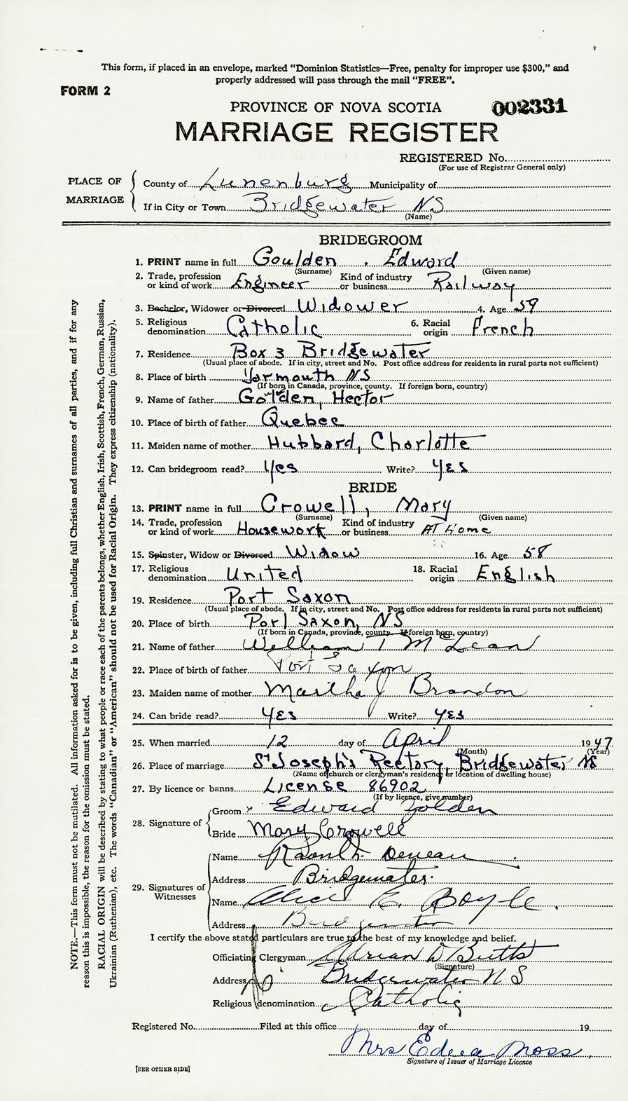 PLACE OF MARRIAGE County of Lunenburg in City or Town Bridgewater