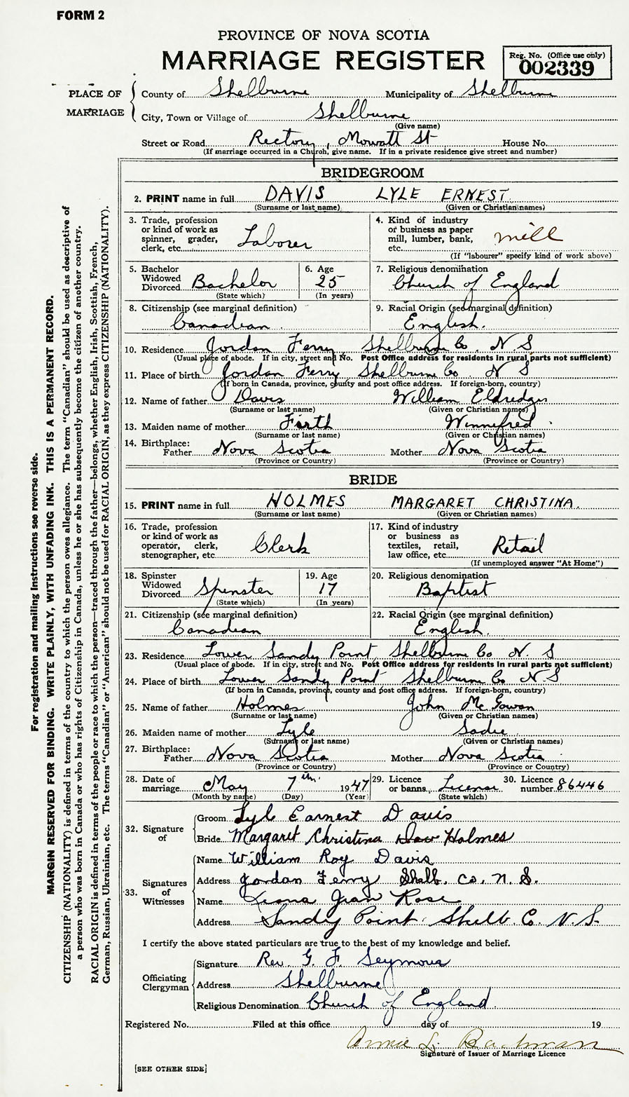 28. Date of marriage May 7 1947 29. By license or banns License 30. License number 89446