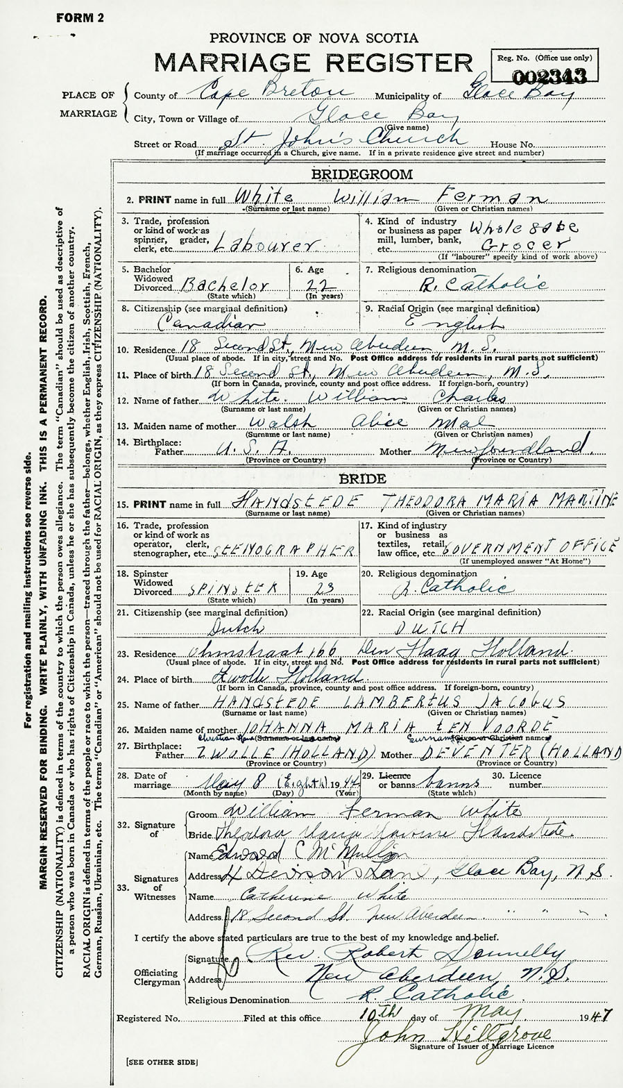 28. Date of marriage May 8 1947 29. By license or banns License 30. License number
