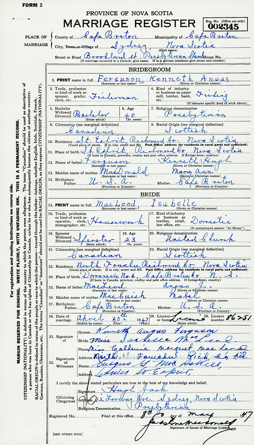 28. Date of marriage April 30 1947 29. By license or banns License 30. License number 86251