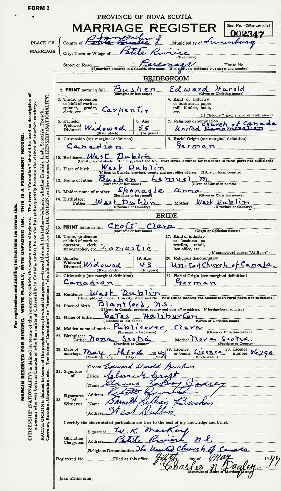 28. Date of marriage May 3 1947 29. By license or banns License 30. License number 86790