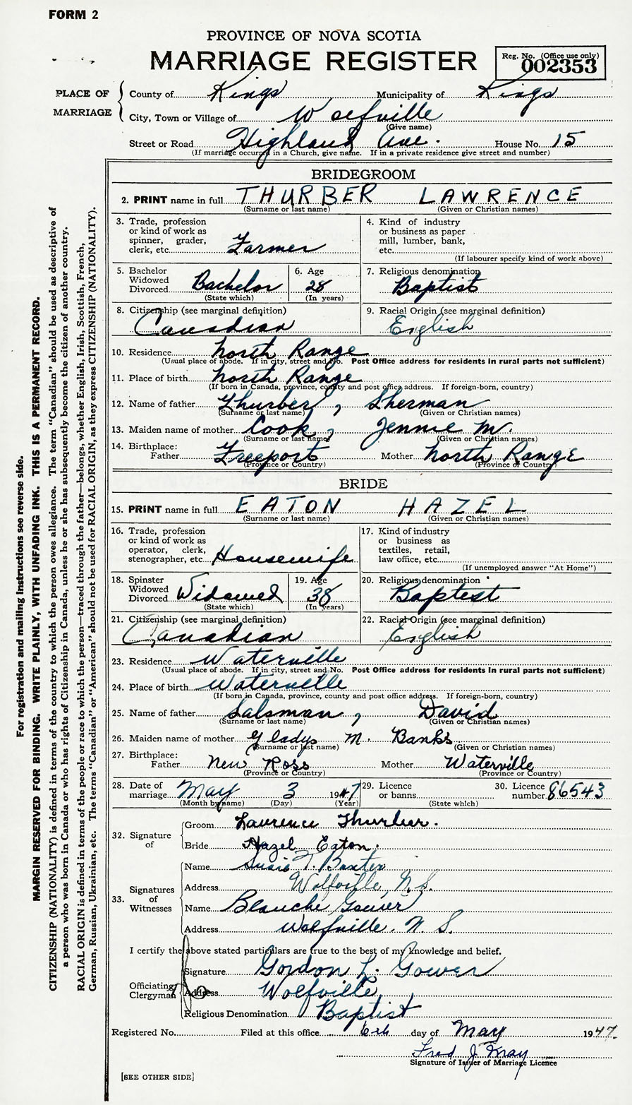 28. Date of marriage May 3 1947 29. By license or banns License 30. License number 86543