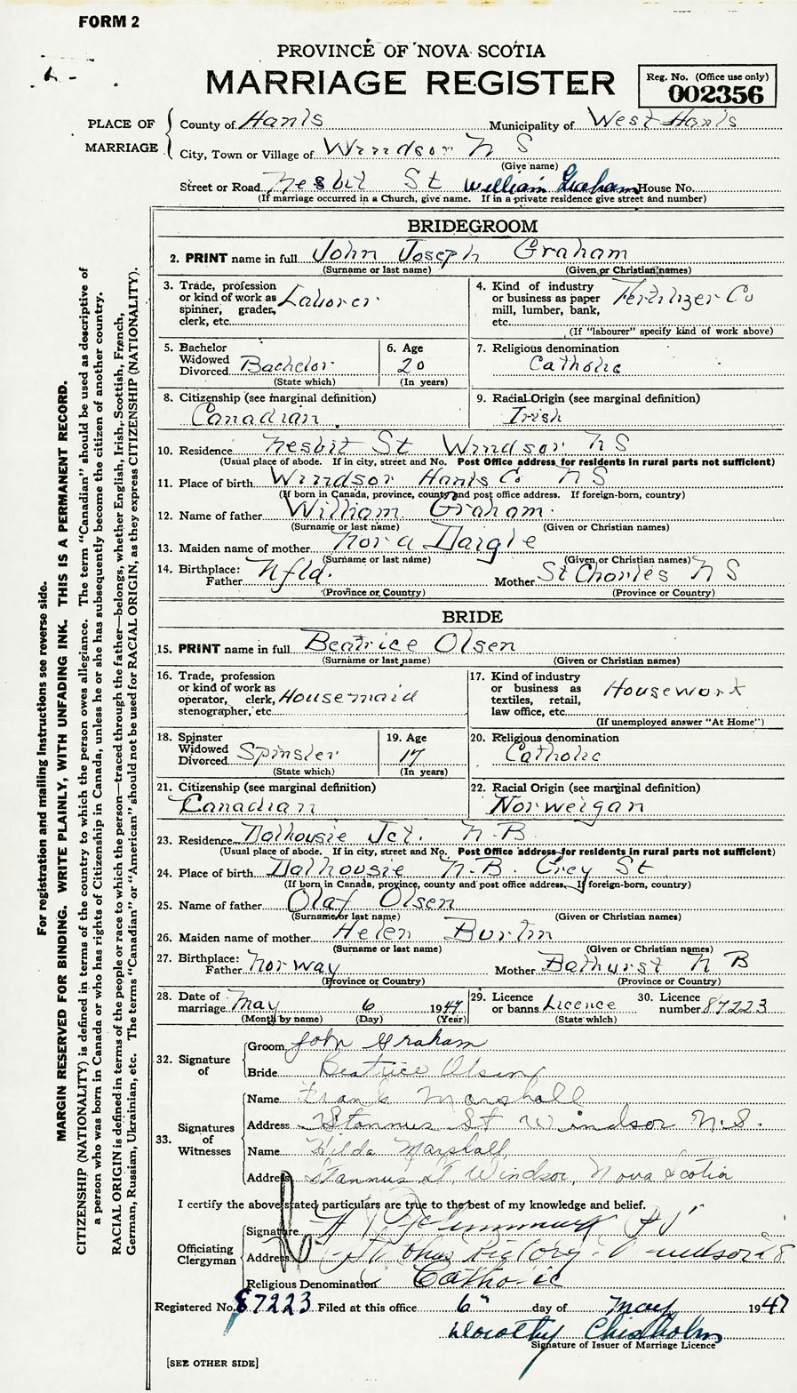28. Date of marriage May 6 1947 29. By license or banns License 30. License number 87223