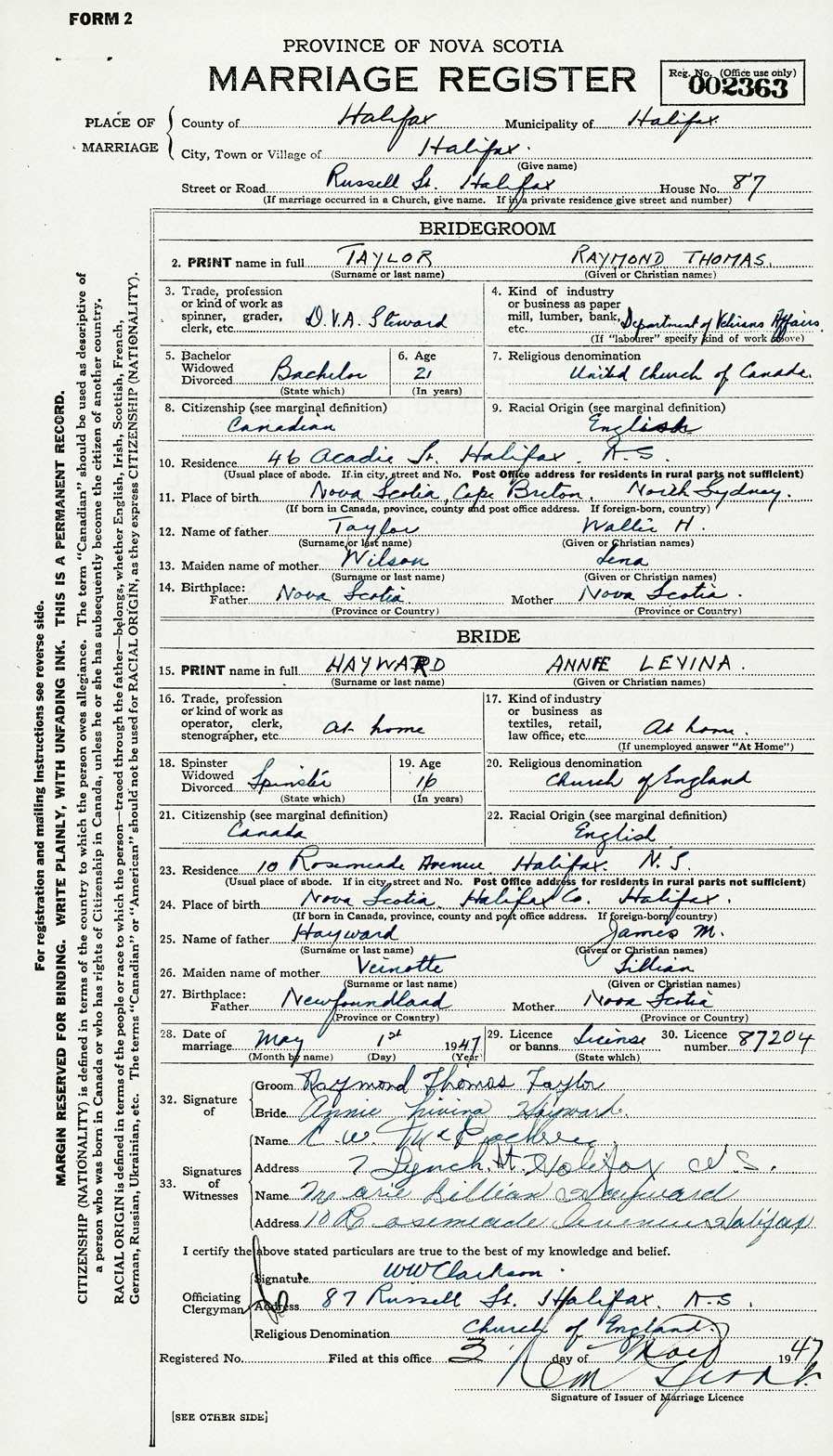 28. Date of marriage May 1 1947 29. By license or banns License 30. License number 87204
