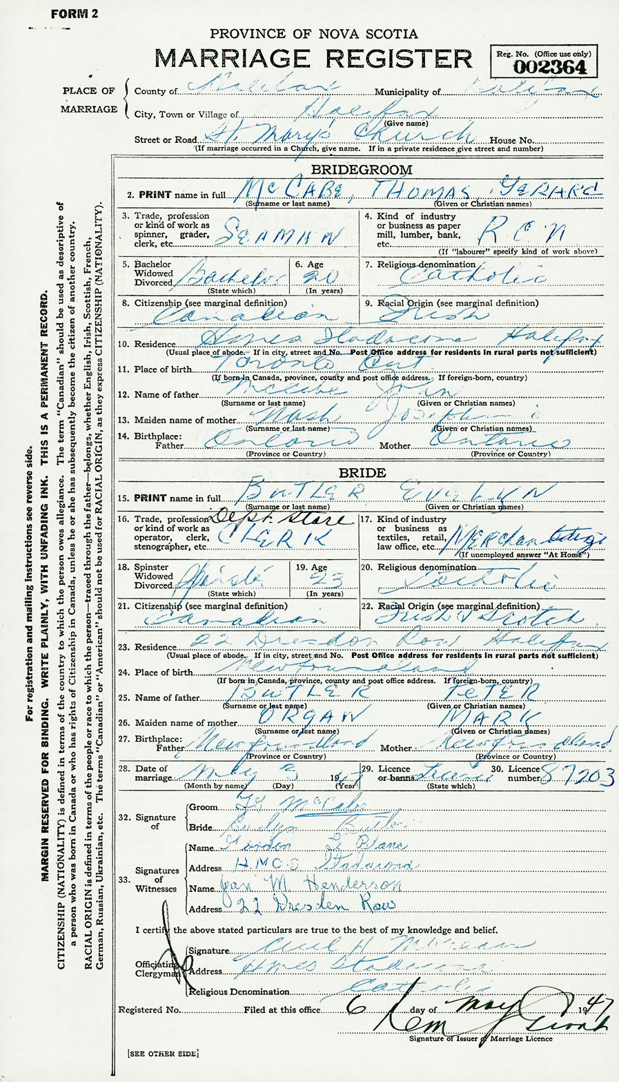 28. Date of marriage May 3 1947 29. By license or banns License 30. License number 87203