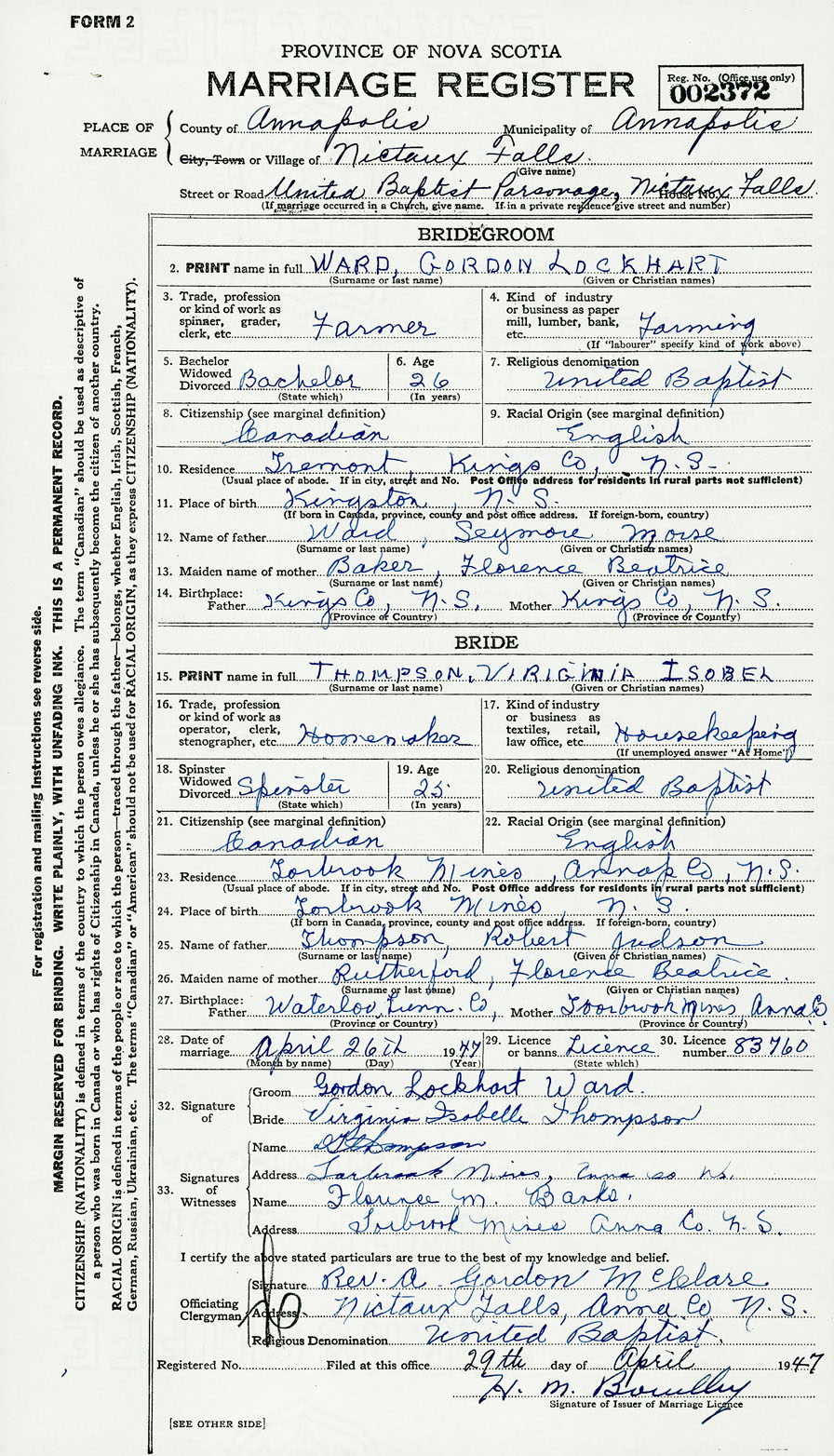 27. Birthplace Father Waterloo, Lunenburg County Mother Torbrook Mines, Annapolis County