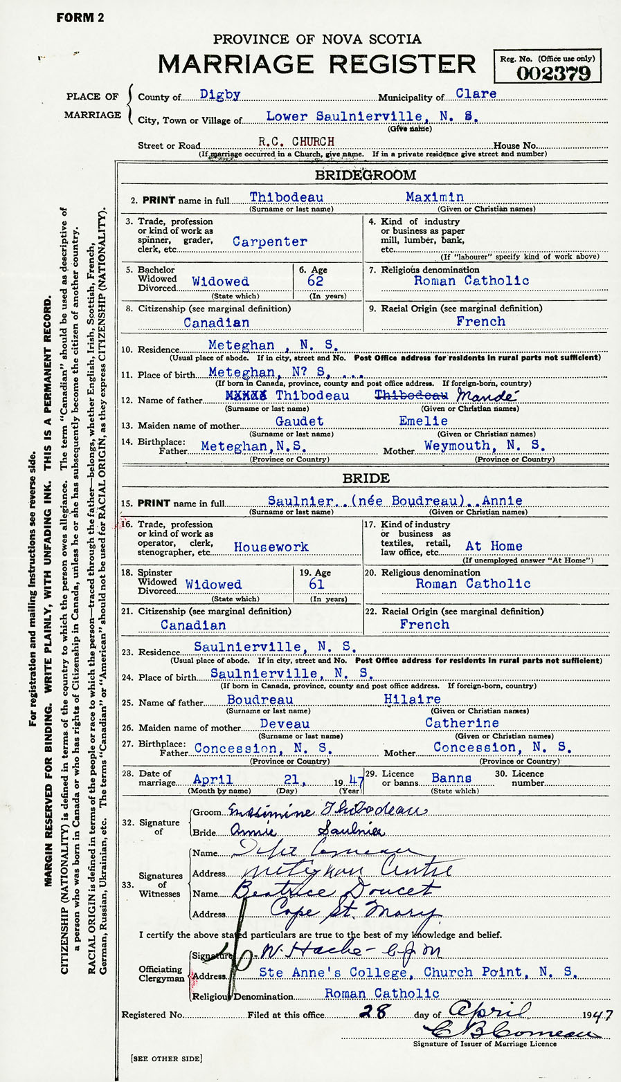 Bride Annie (nee Boudreau) Saulnier